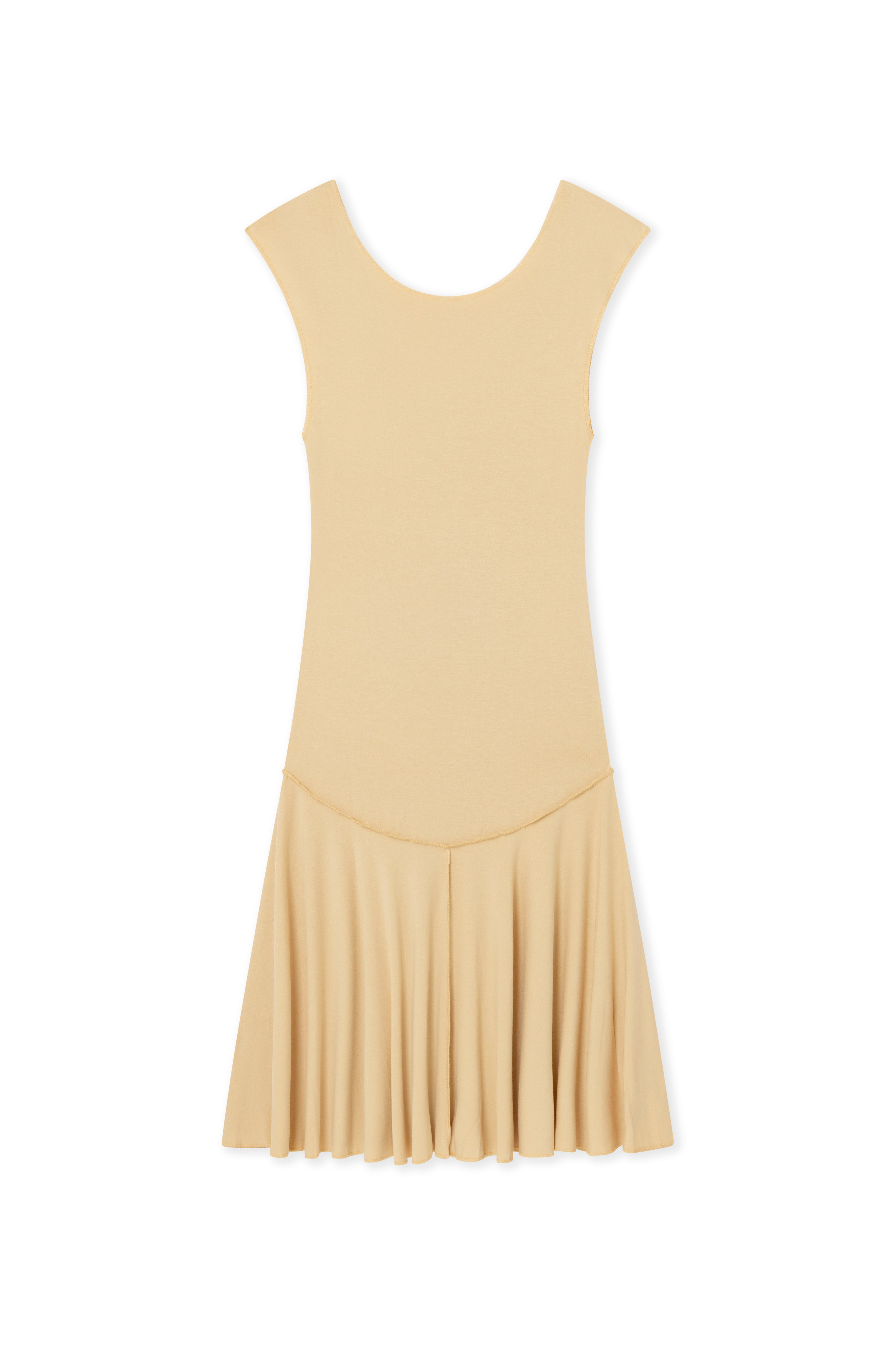 Sleeveless cotton flared dress with gathered detail at the center.
