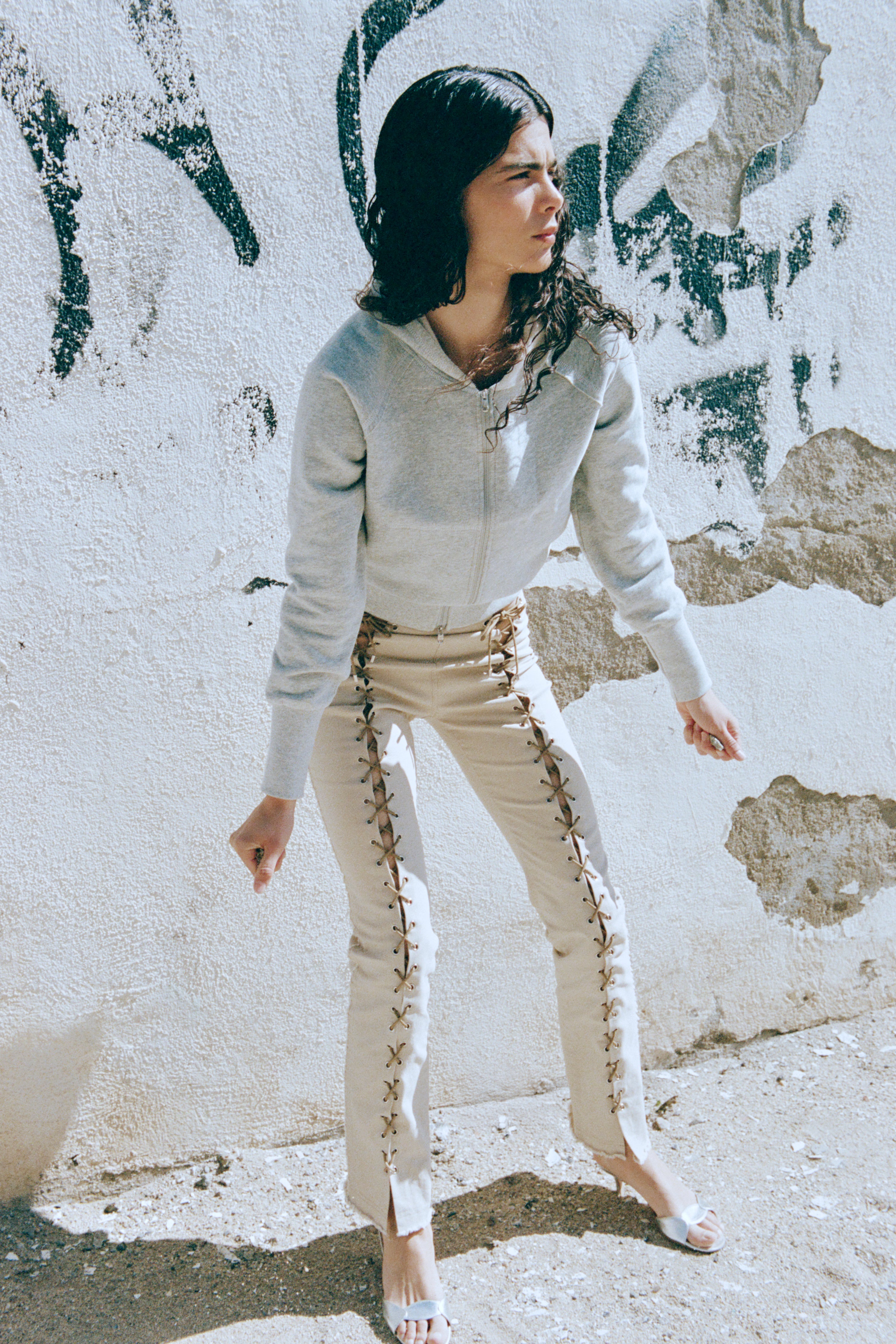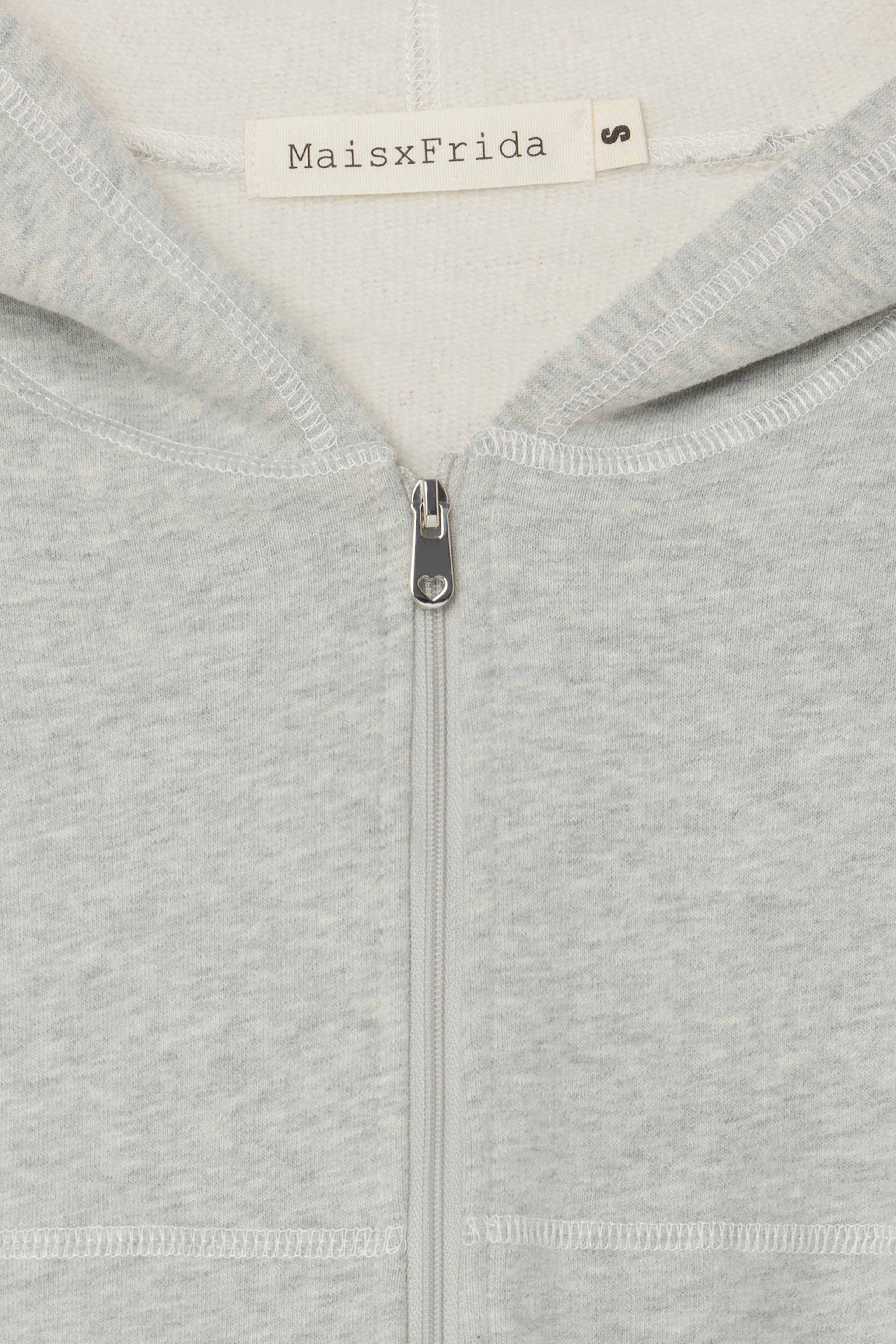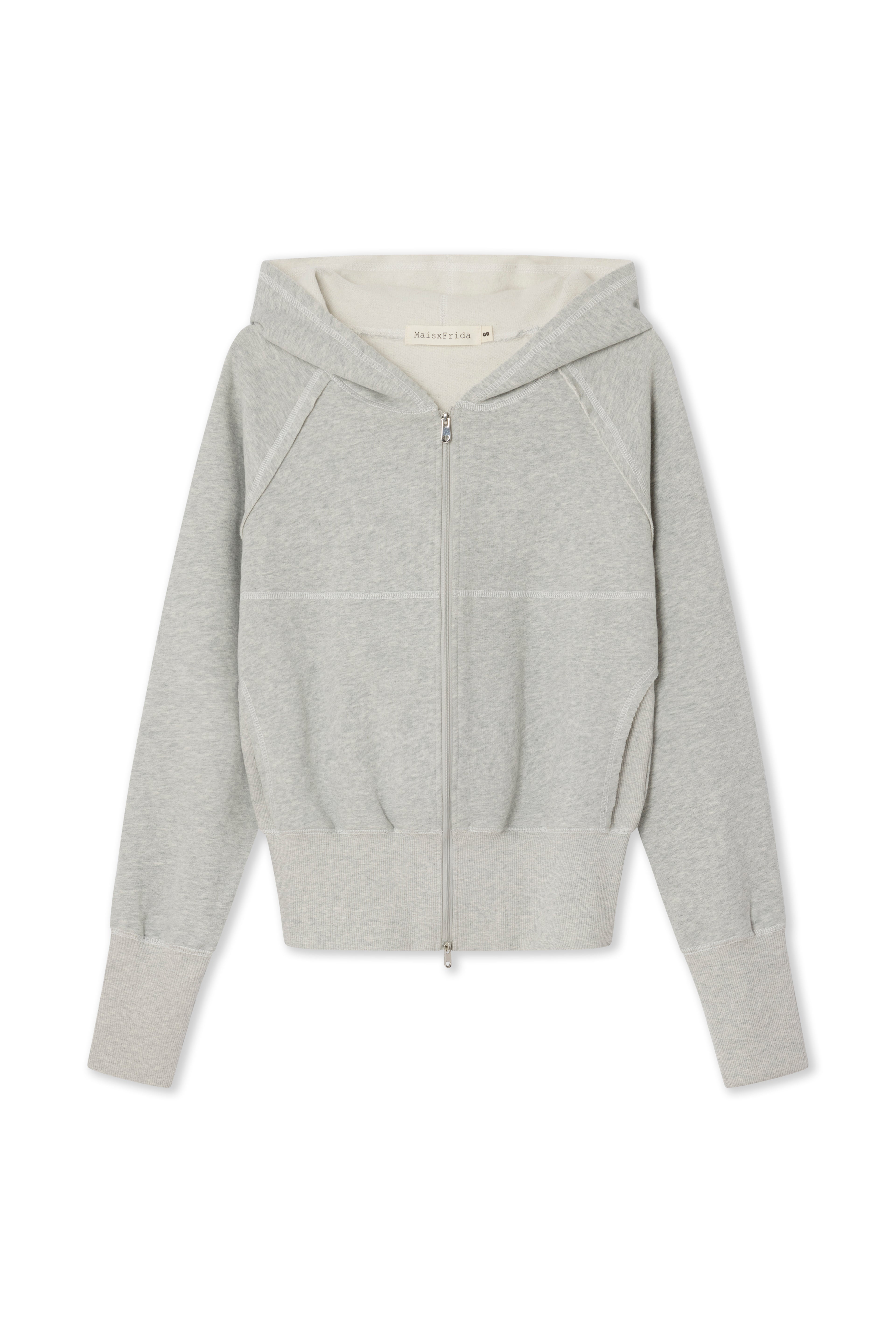 Grey fitted zip-up hoodie crafted with cotton fleece. Features a kangaroo pocket and raw edge details.