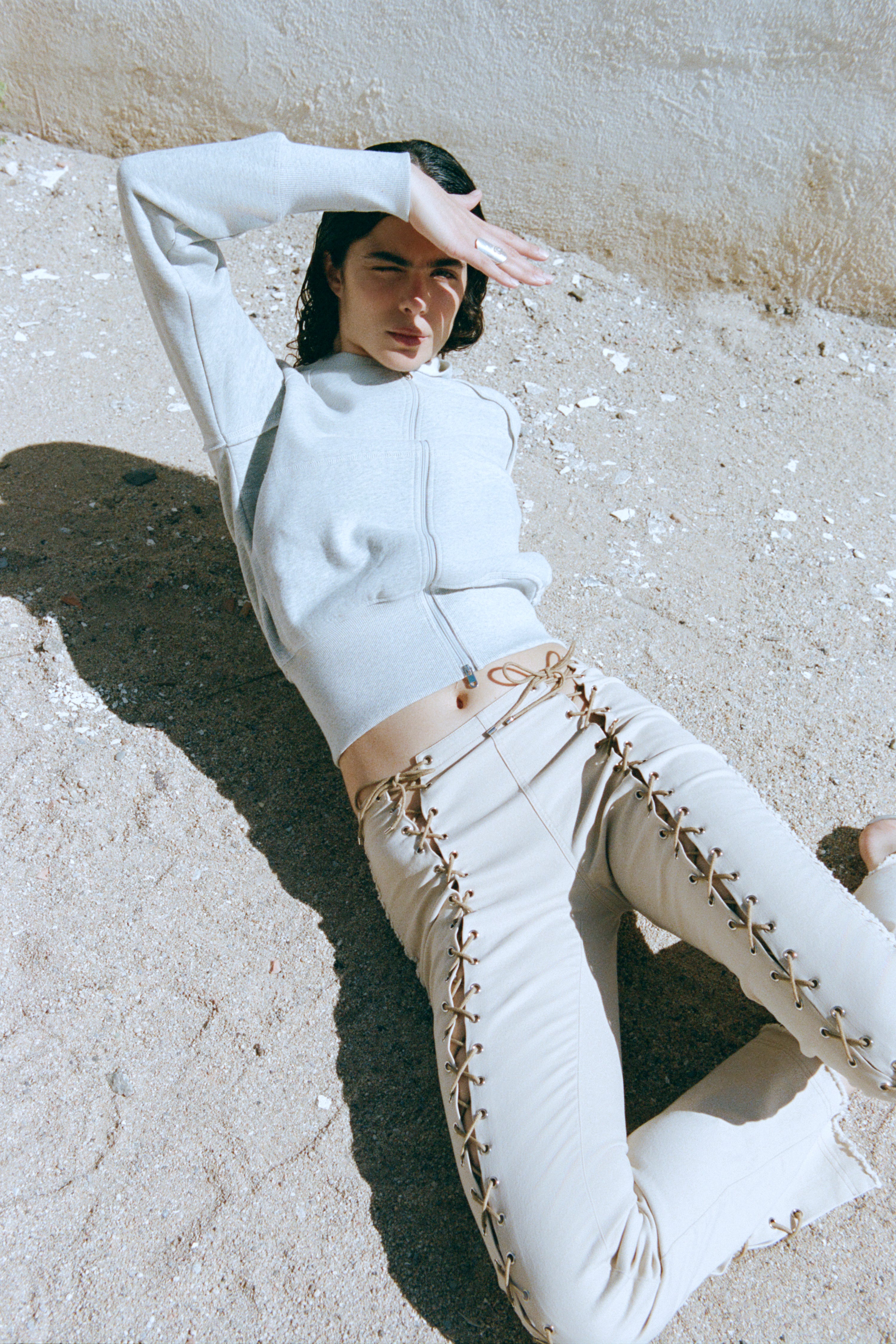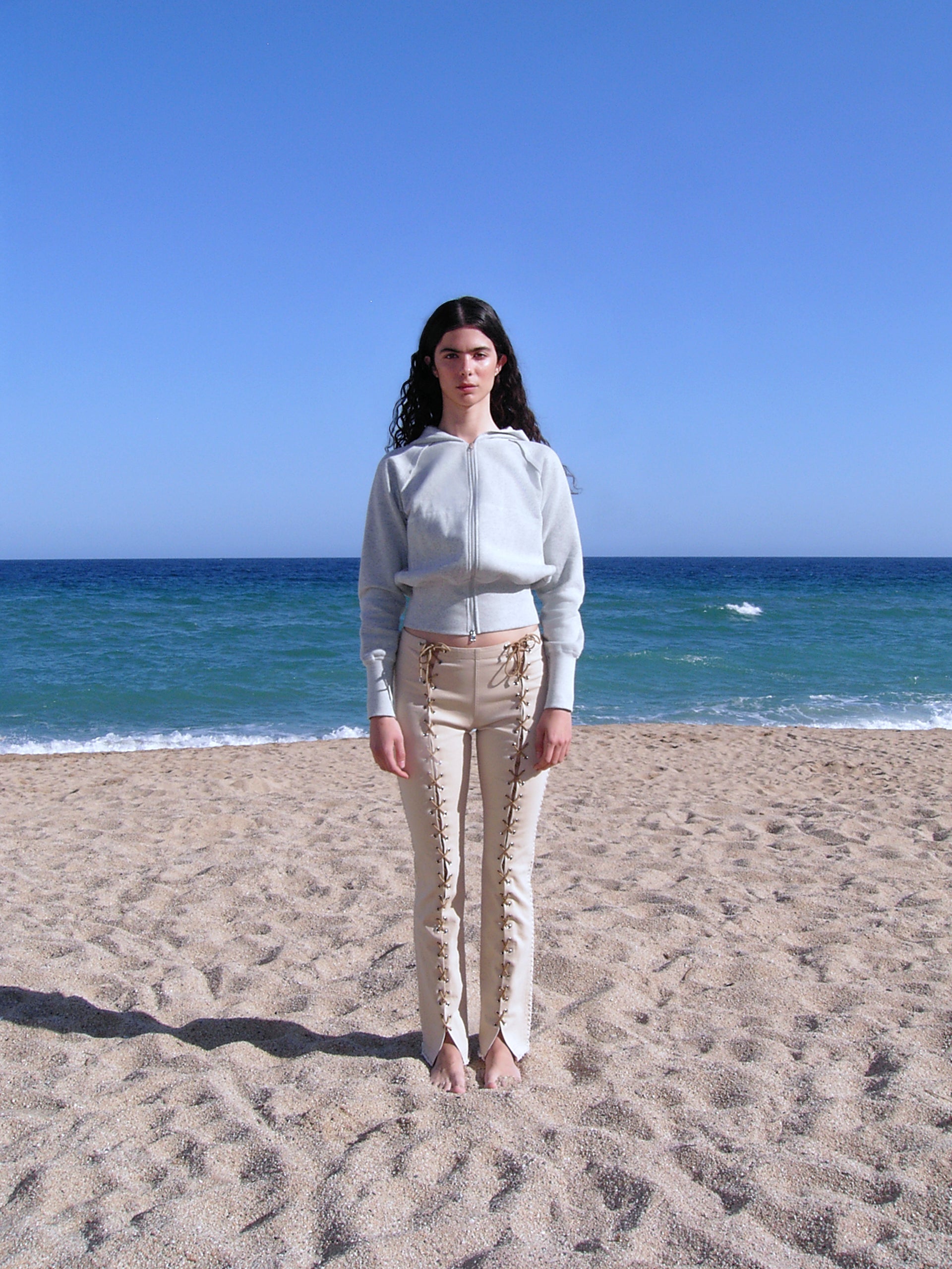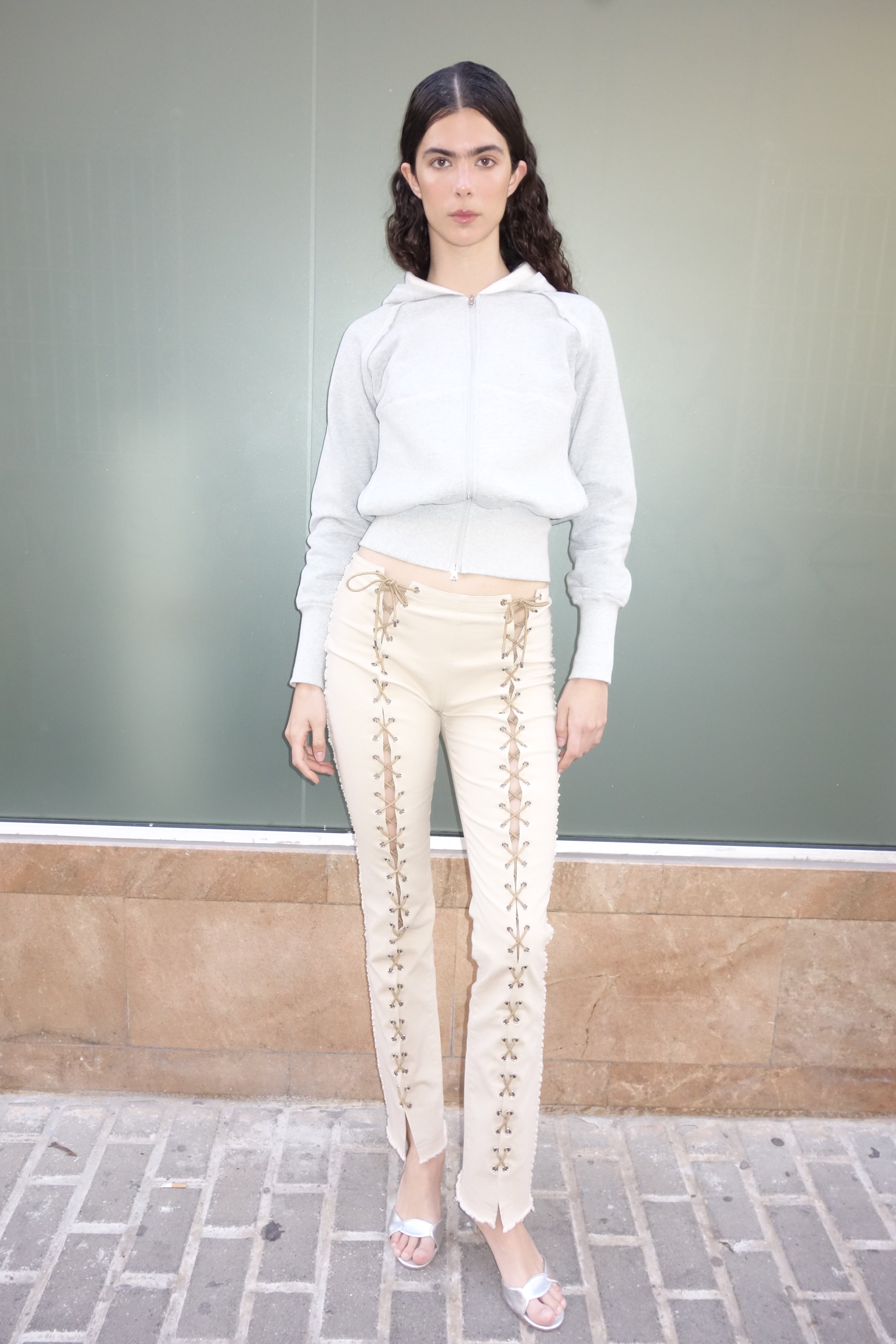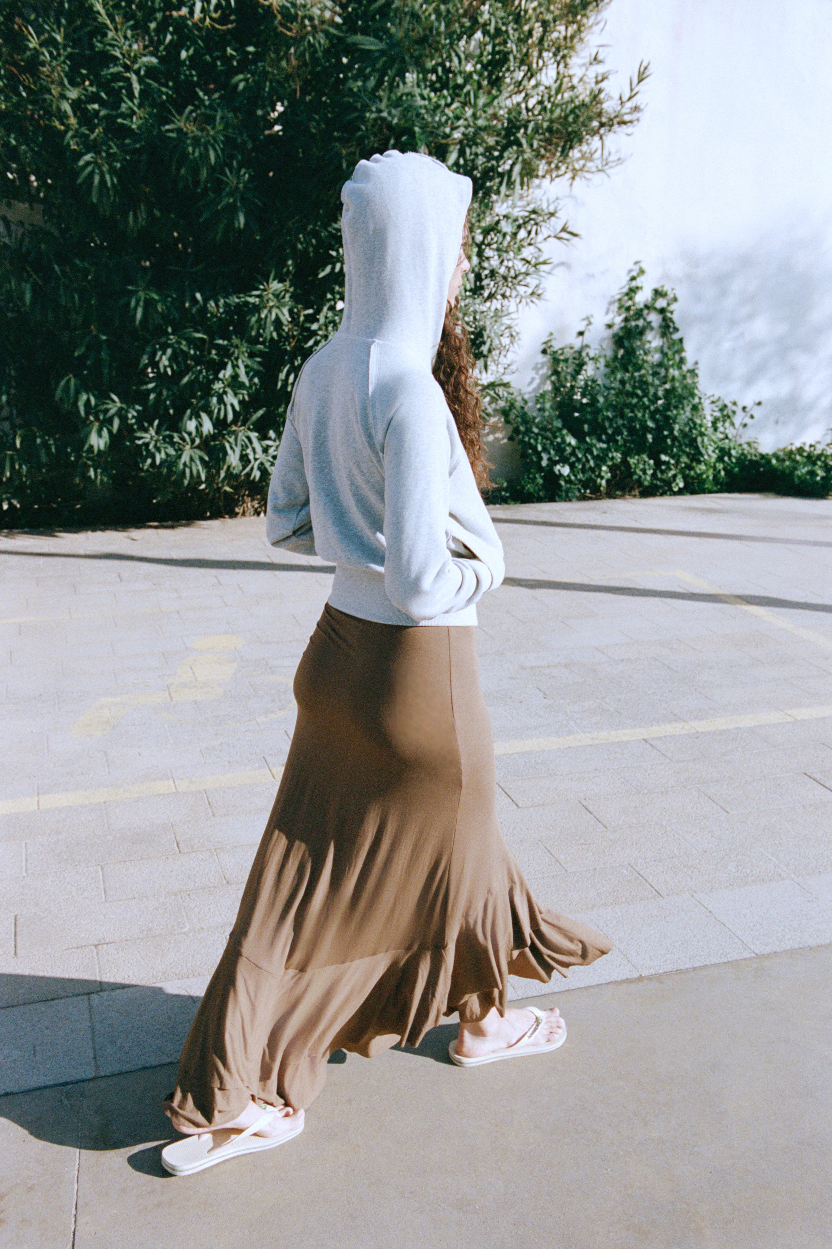 Grey fitted zip-up hoodie crafted with cotton fleece. Features a kangaroo pocket and raw edge details.