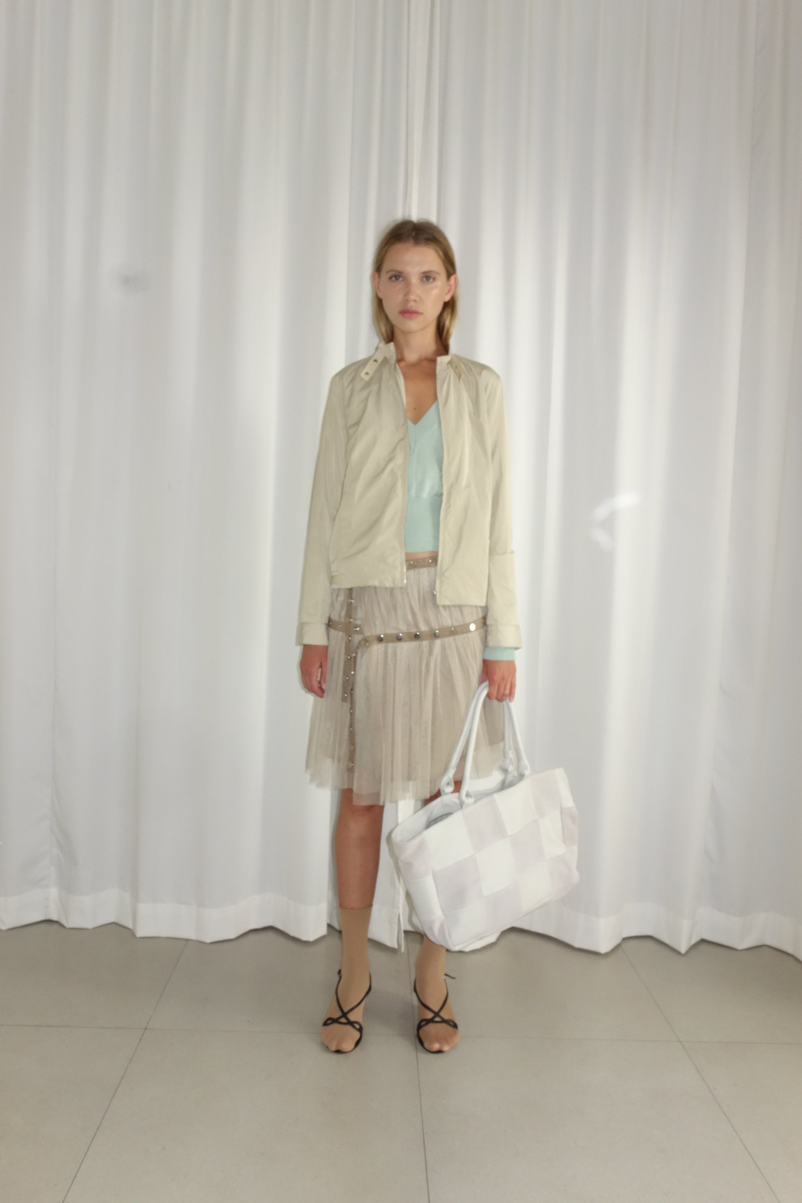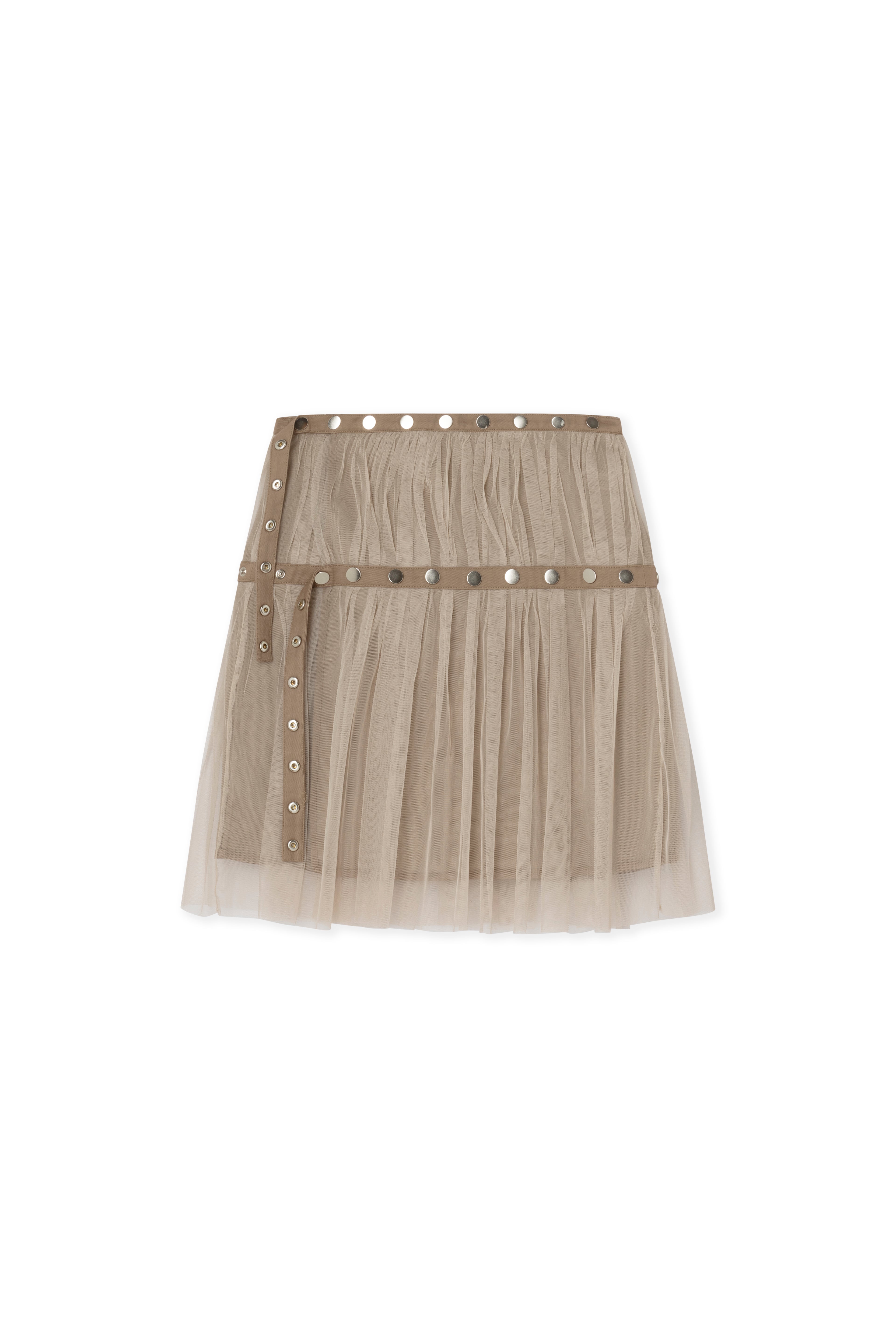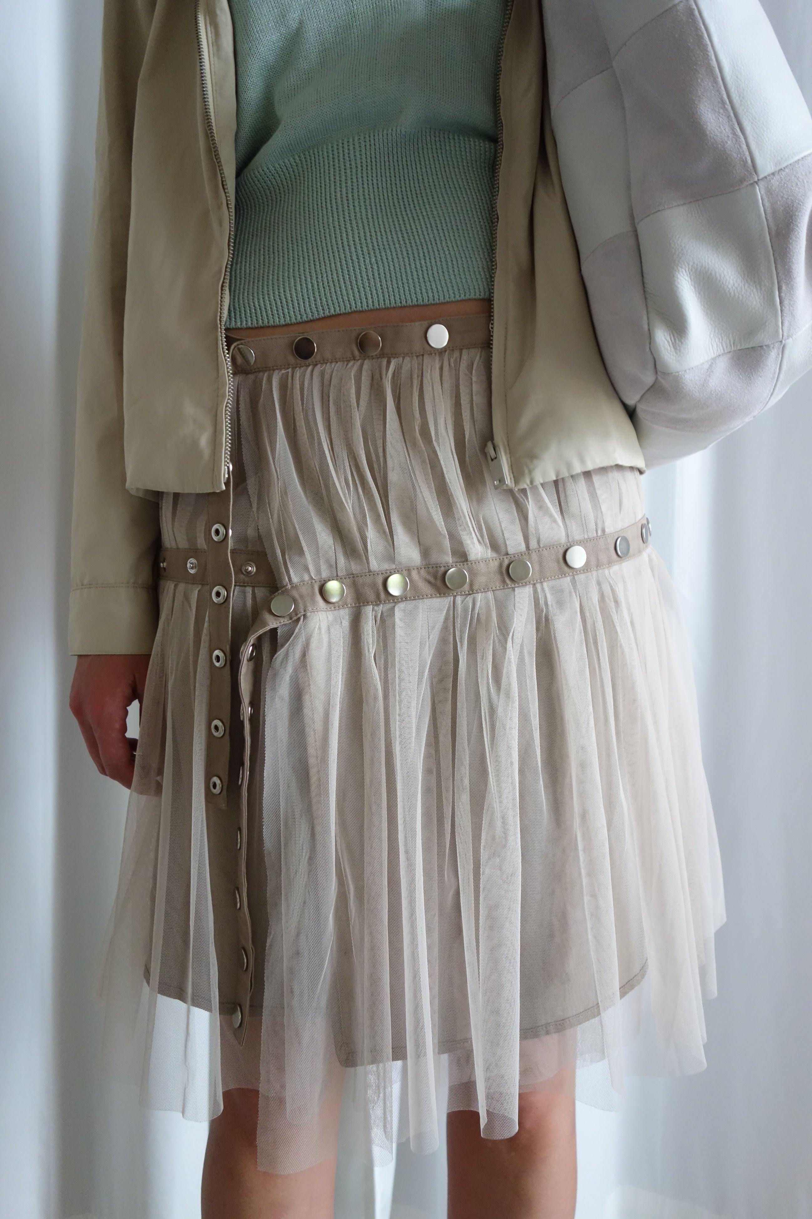 Midi mesh skirt with snap buttons around the waist and hip for adjustable fit.