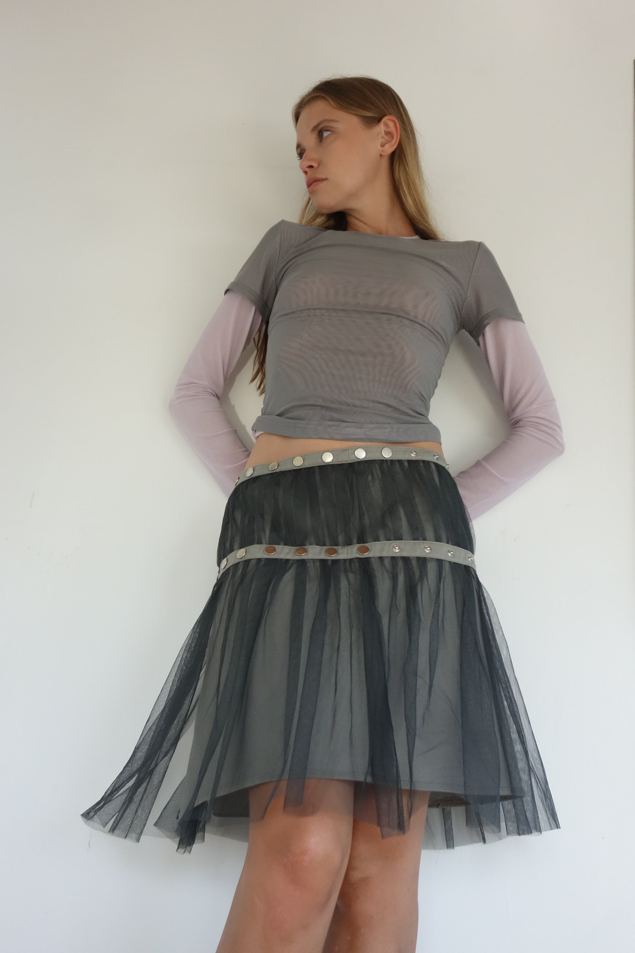 Midi mesh skirt with snap buttons around the waist and hip for adjustable fit.