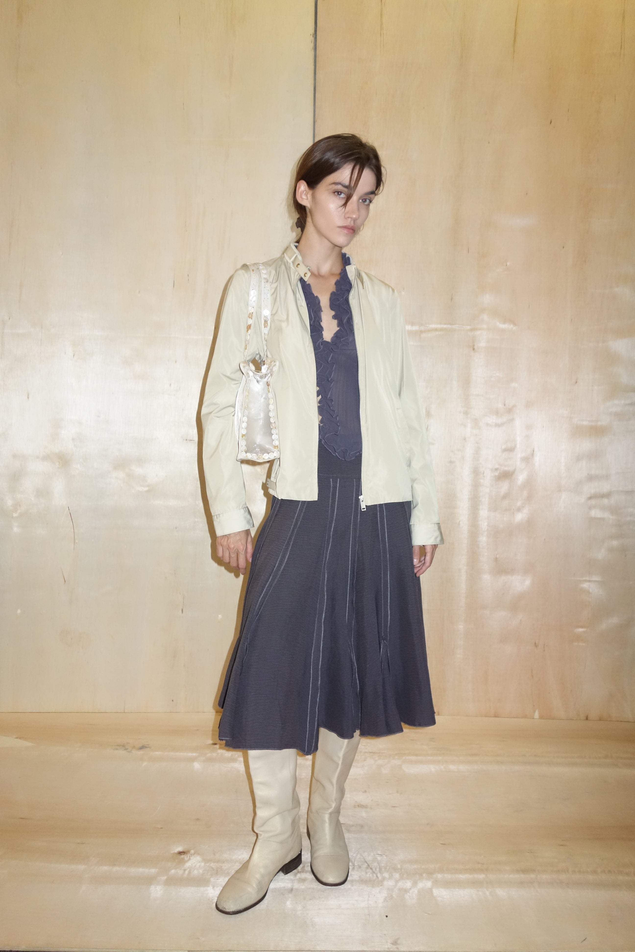 Maxi skirt with godets and exposed seams.