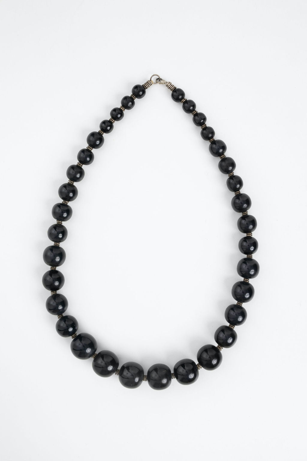Vintage necklace handcrafted with thick beads and silver plated brass disks.