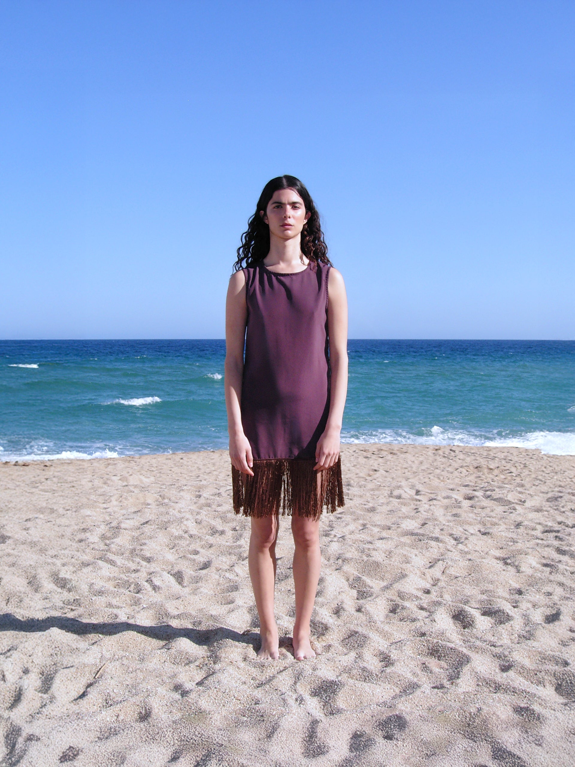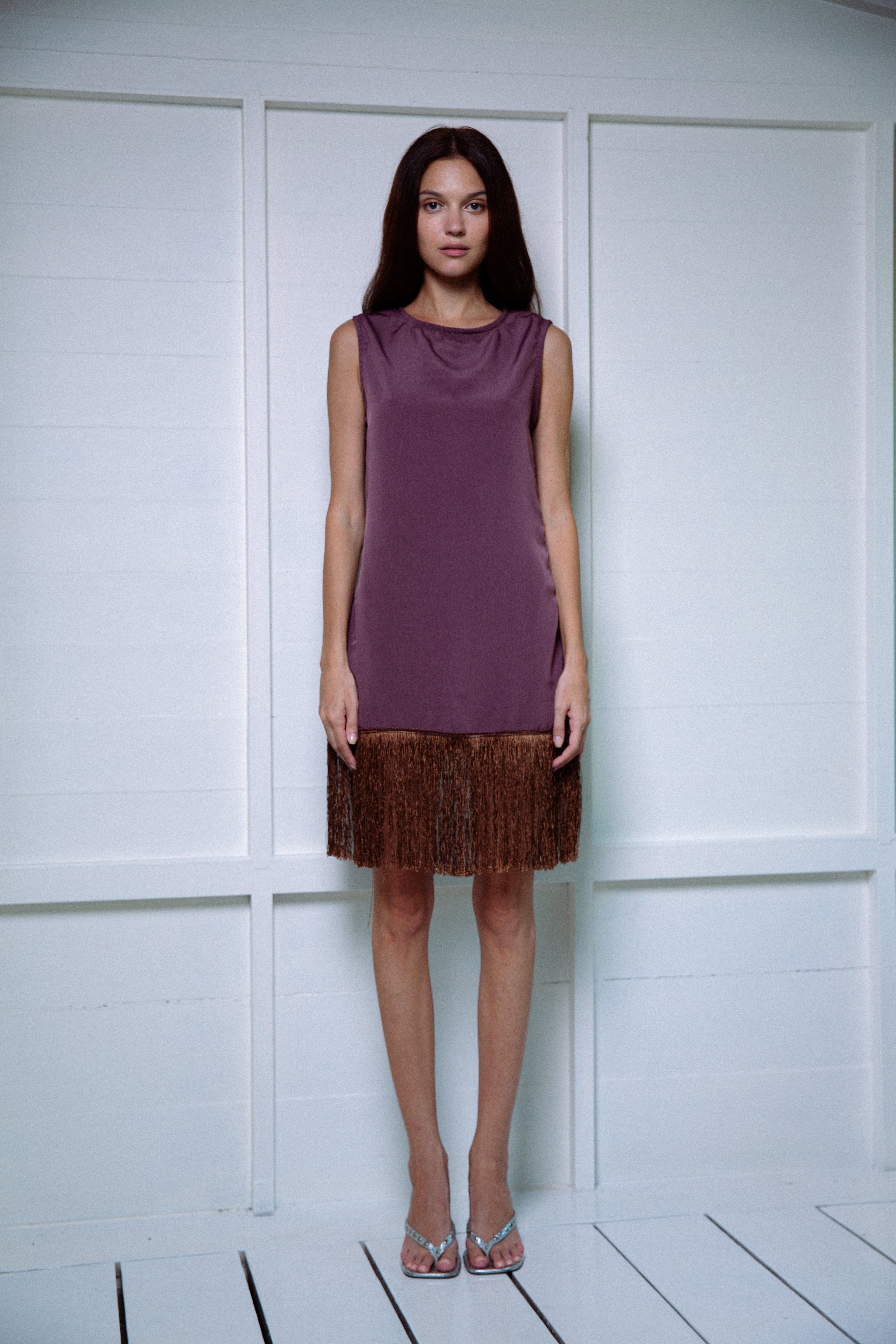 Sleeveless straight-cut short dress with fringe detail at the hem.