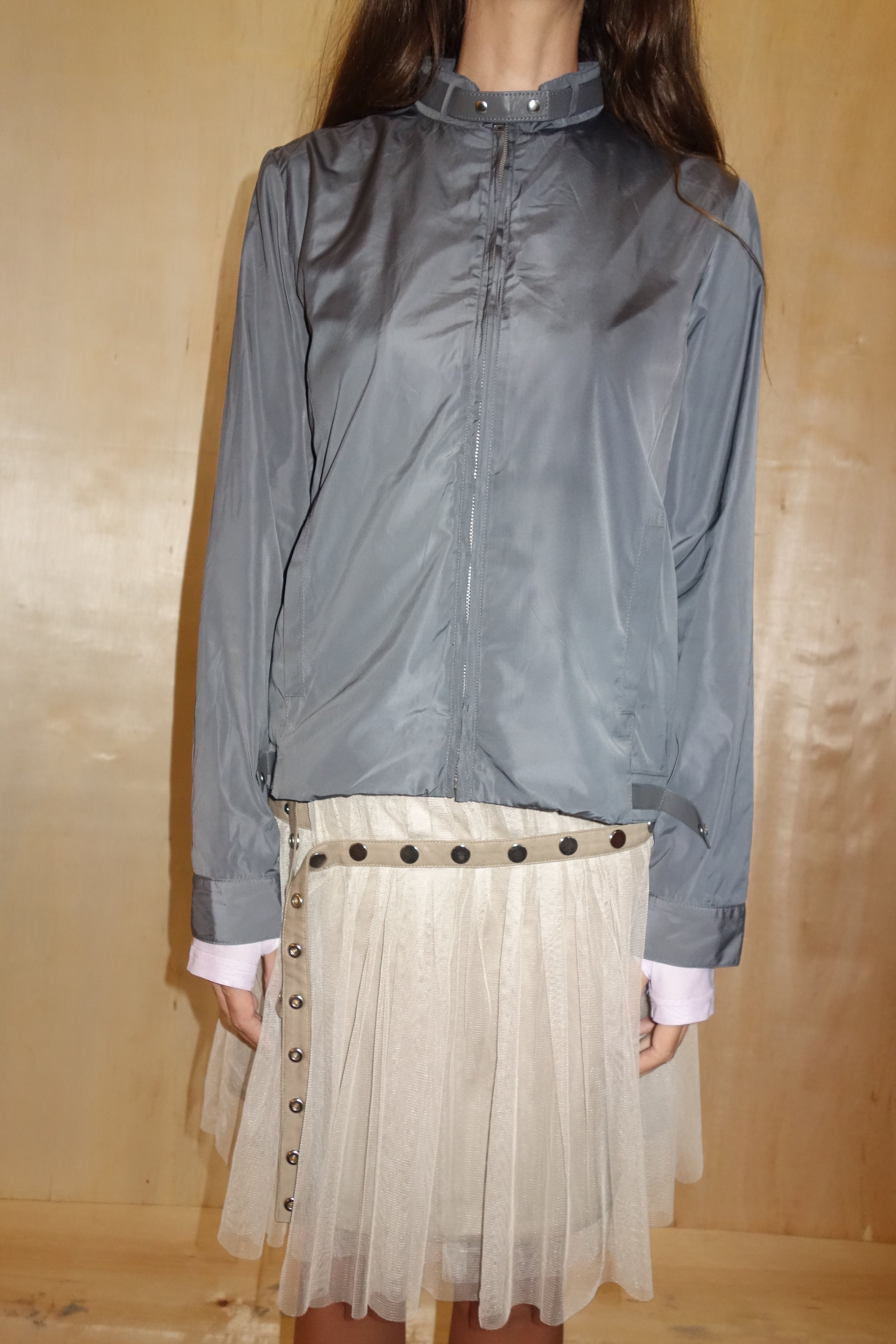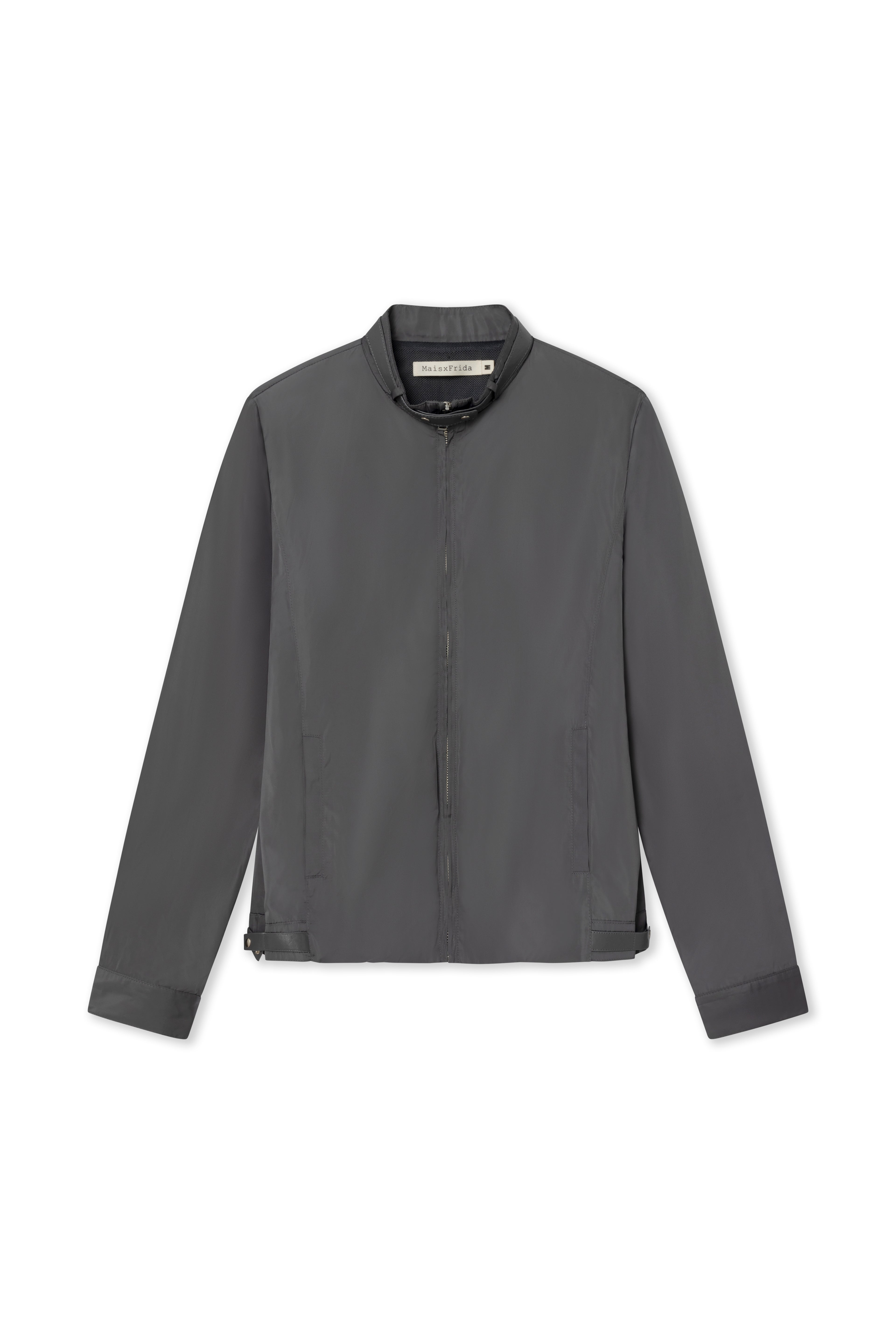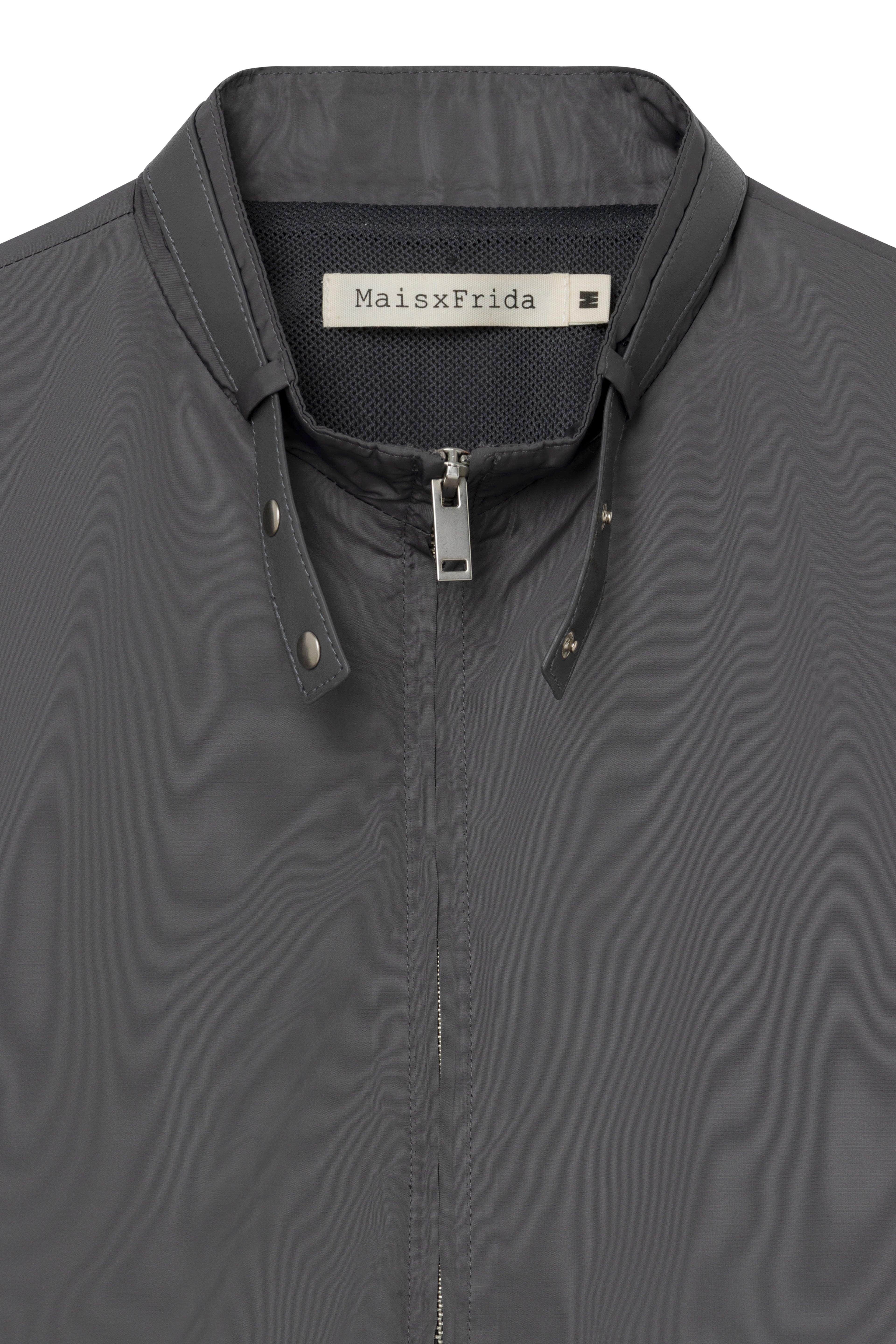 Sporty jacket with seam pockets and buckle detailing at the neck and sides.