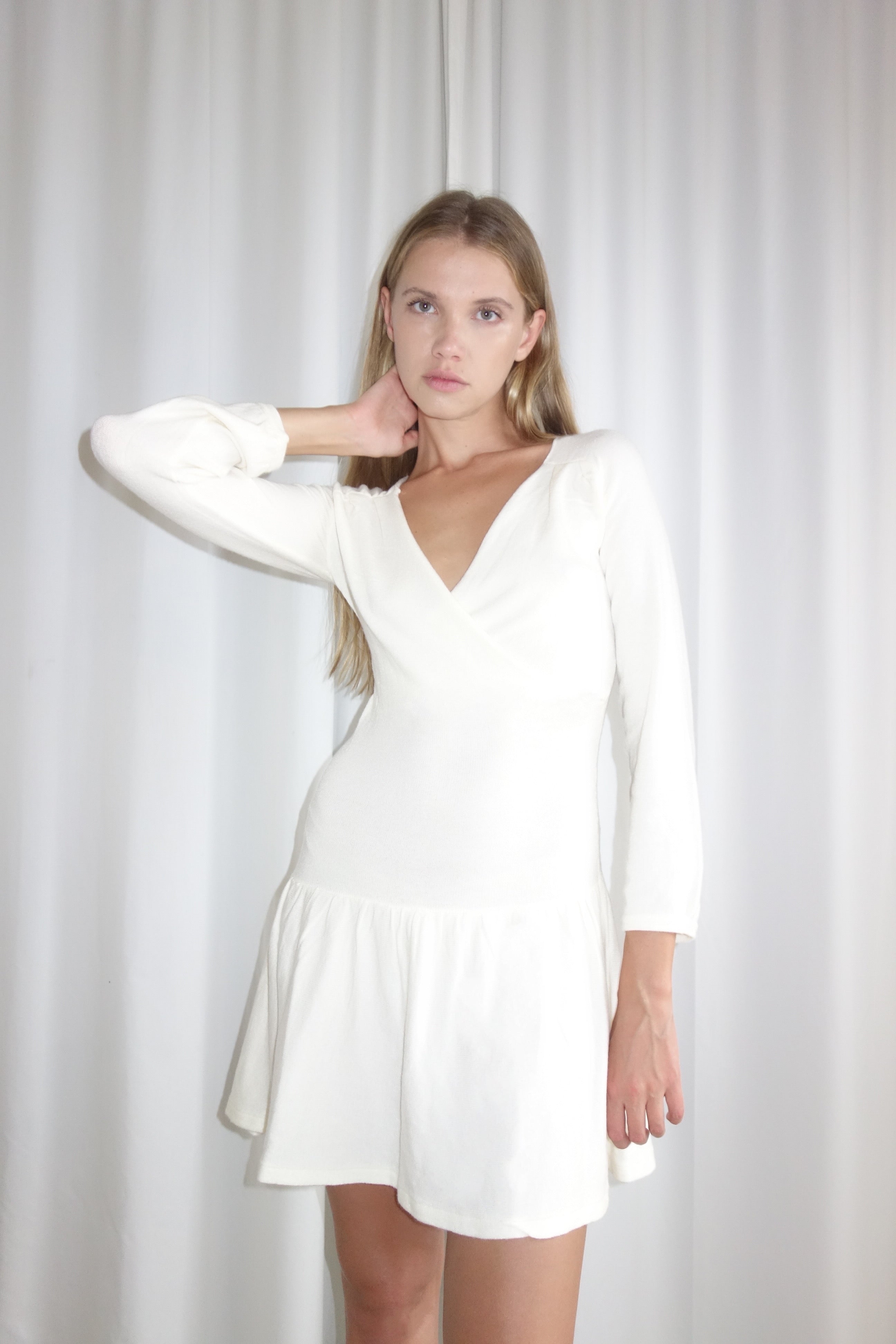 Knitted mini dress with gathered skirt and wrap neckline.