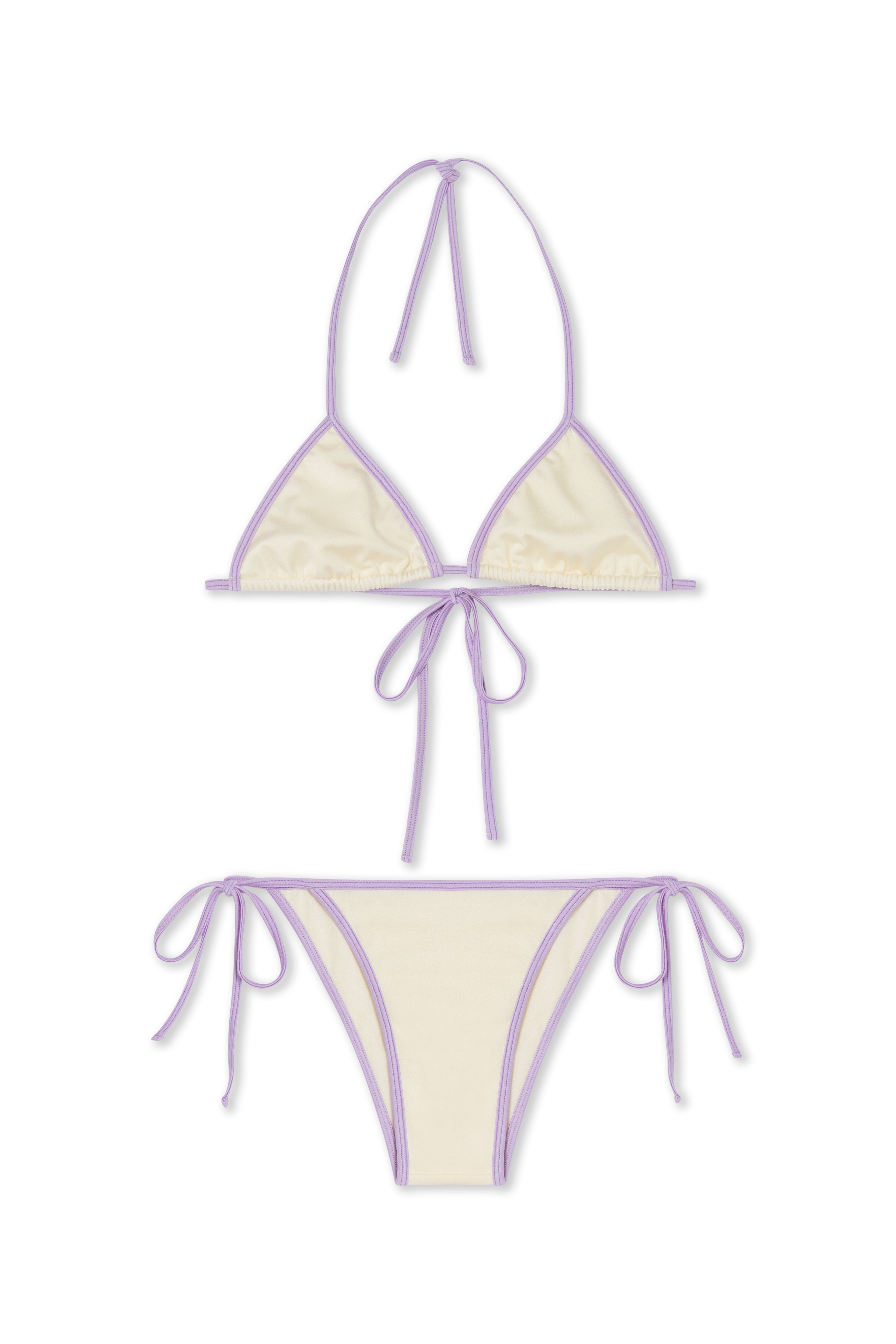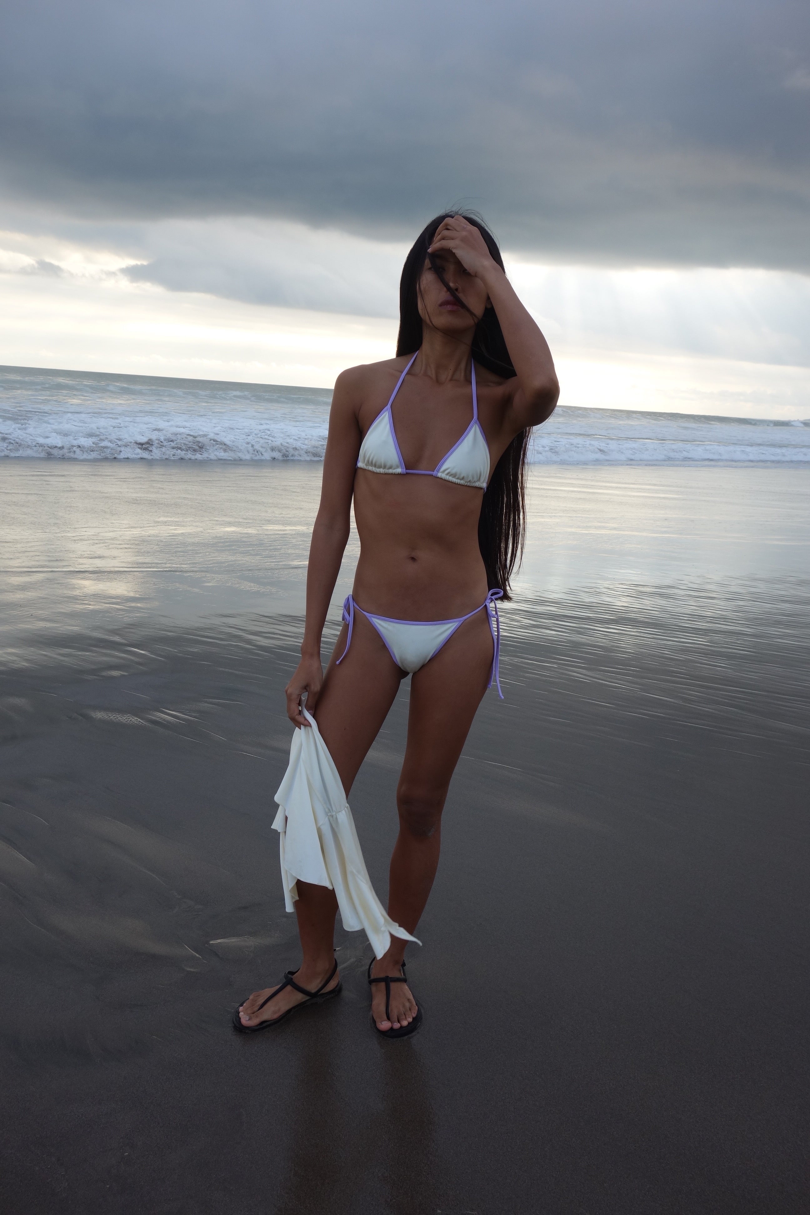 Triangle bikini top with adjustable straps. Fully lined bottom with ties.
