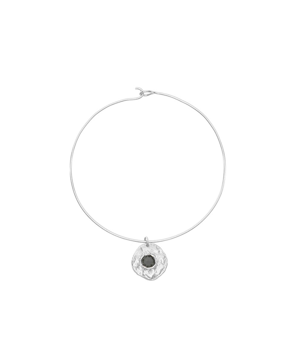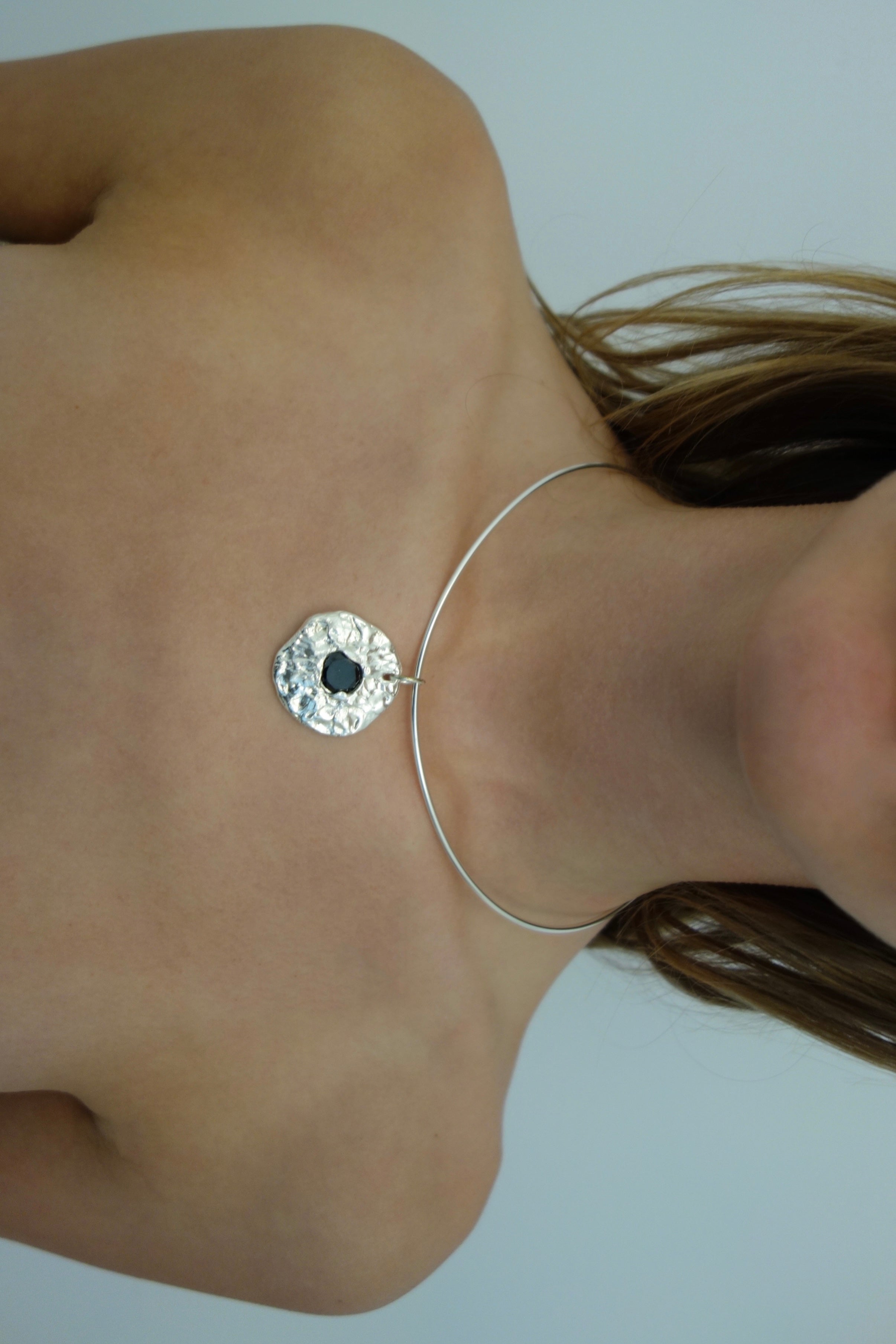 The Kaia Charm Choker features a stunning silver wire necklace and hammered coin with black stone charm. This piece draws inspiration from the full moon.