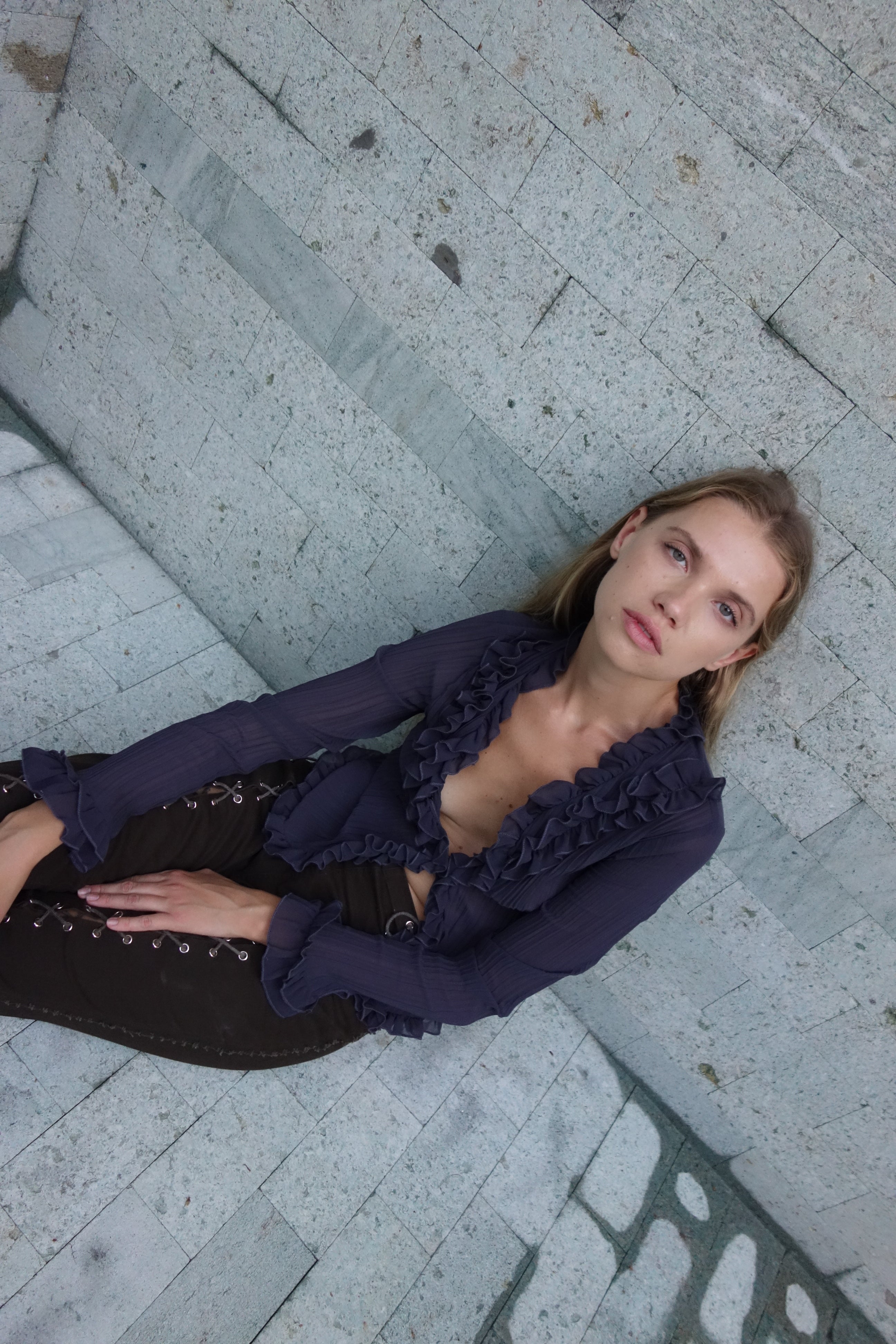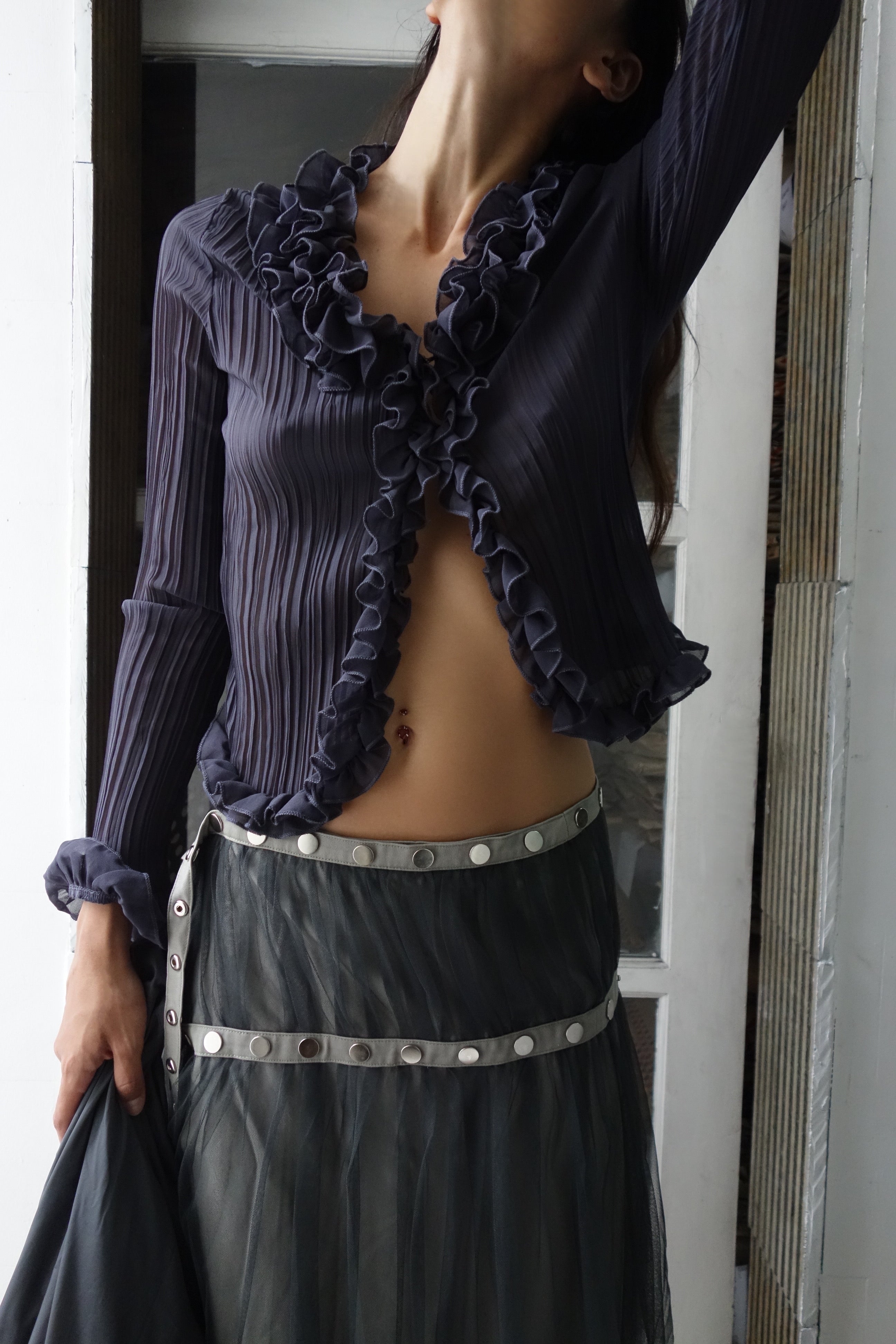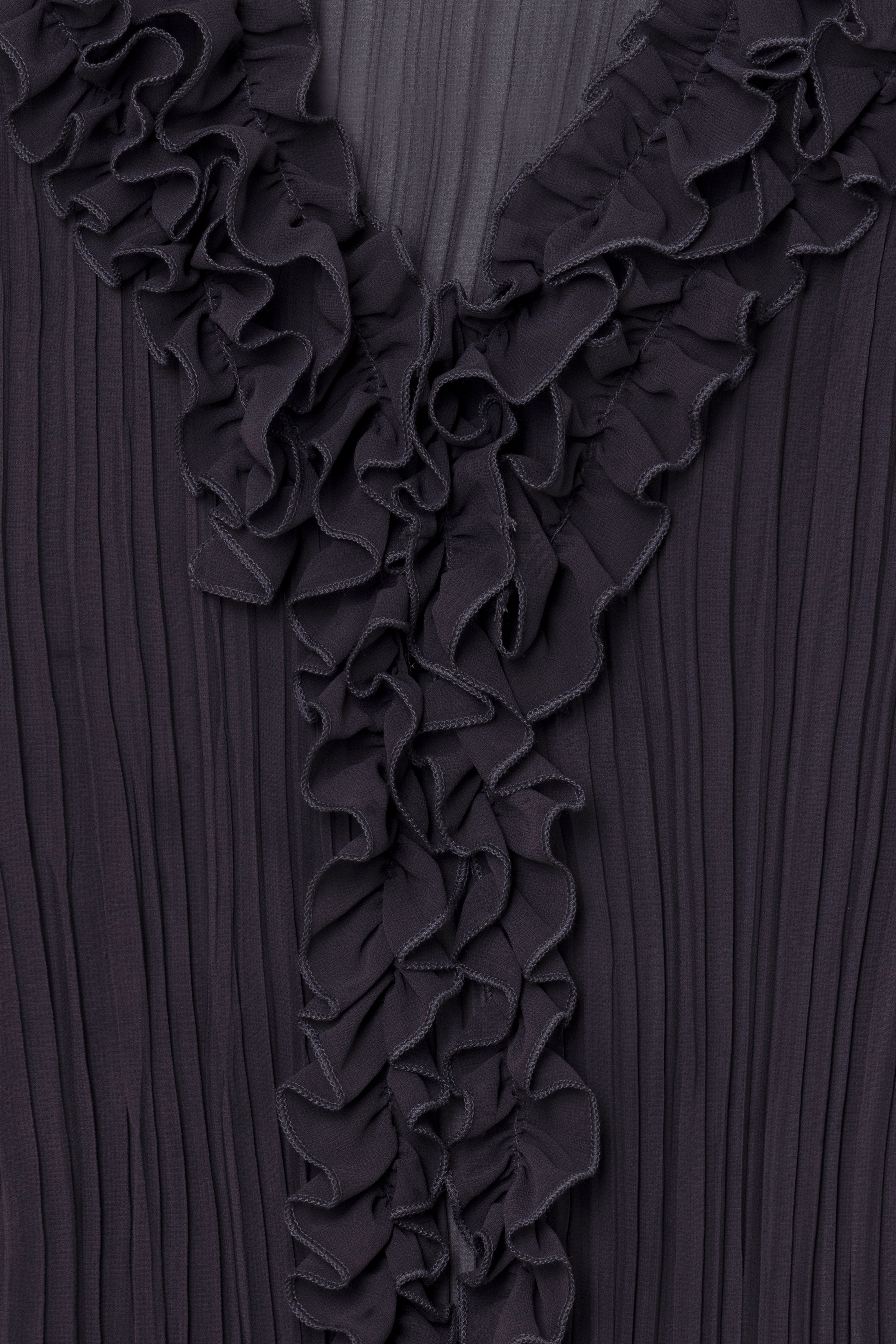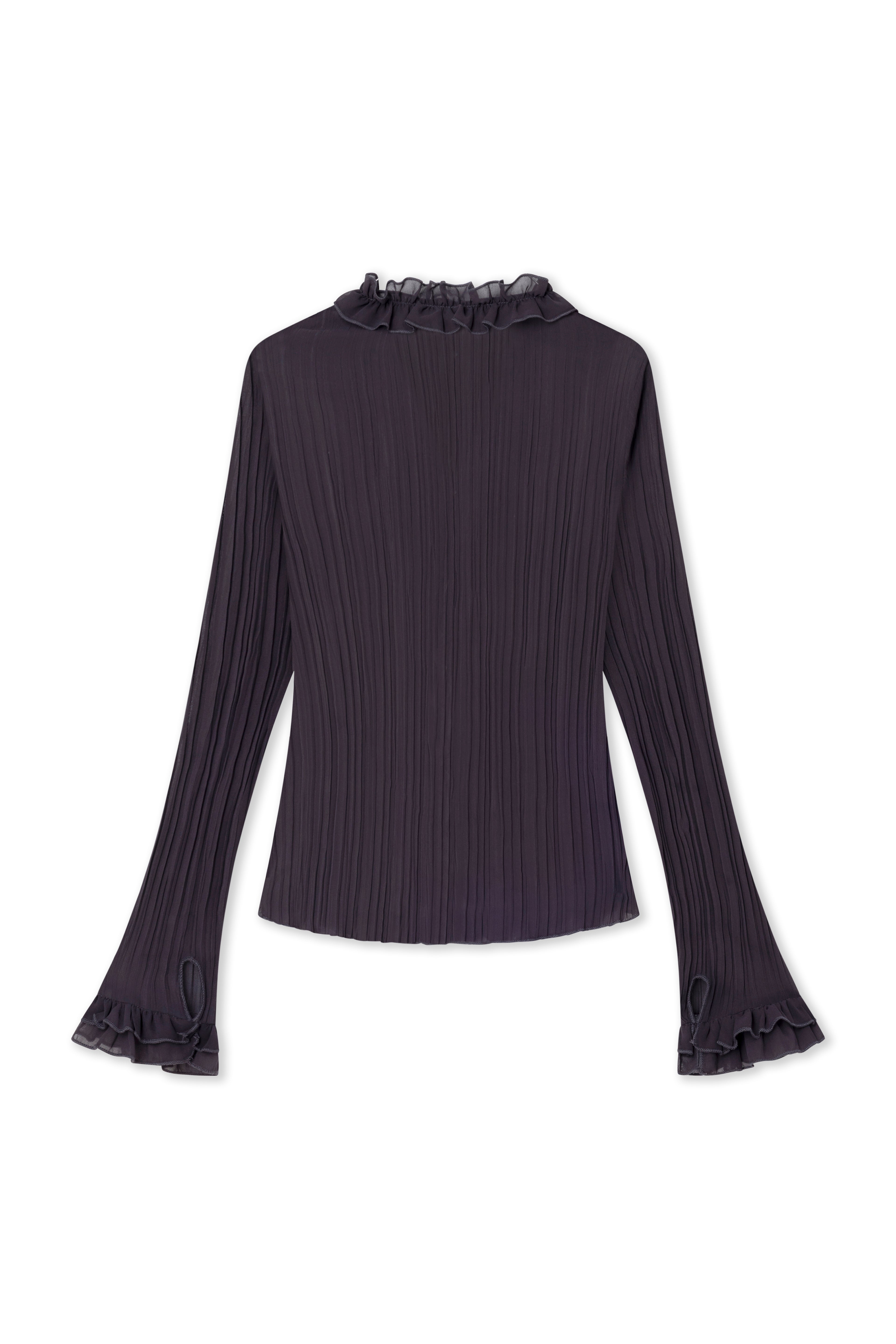 Pleated blouse with ruffles on the neckline and hem.