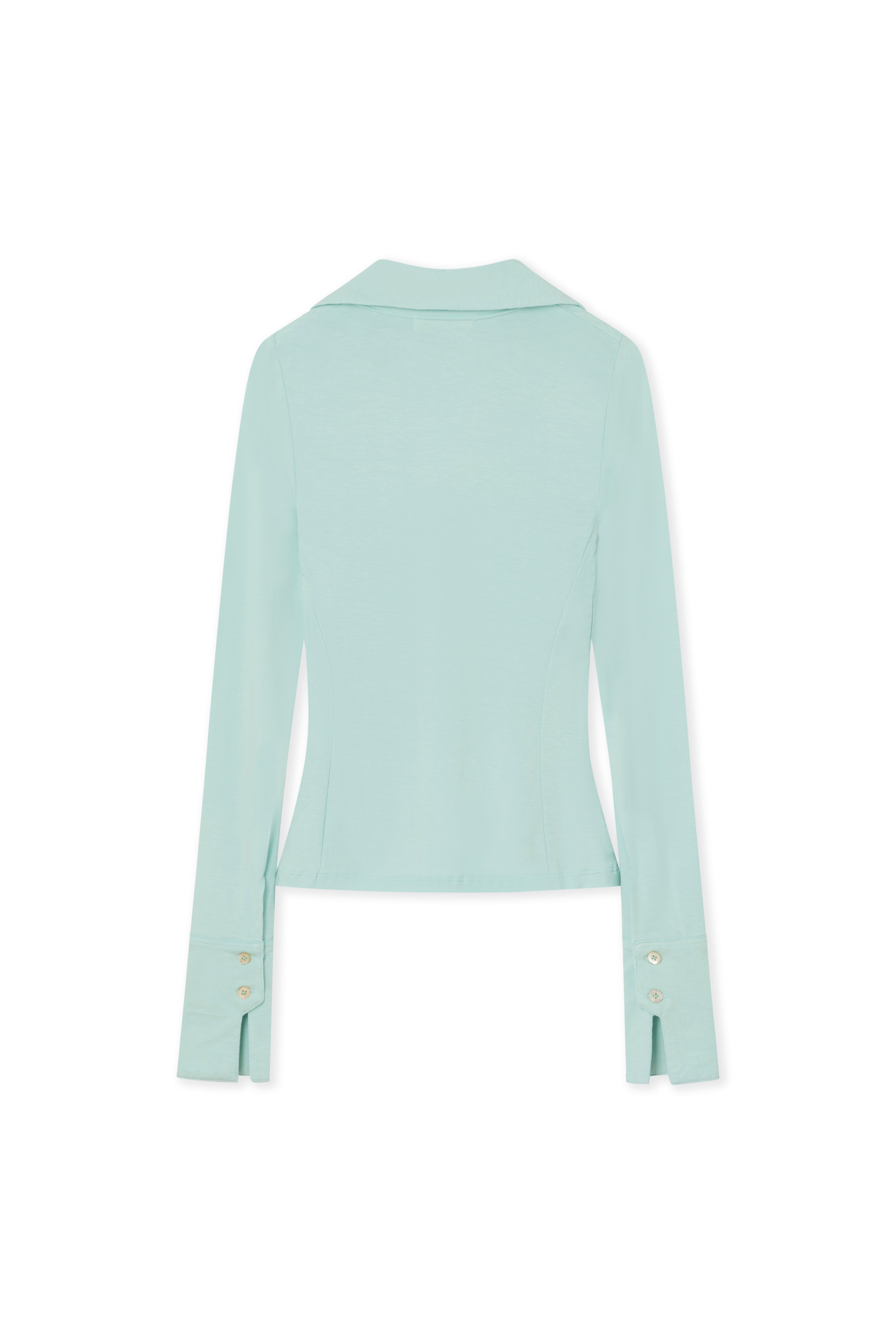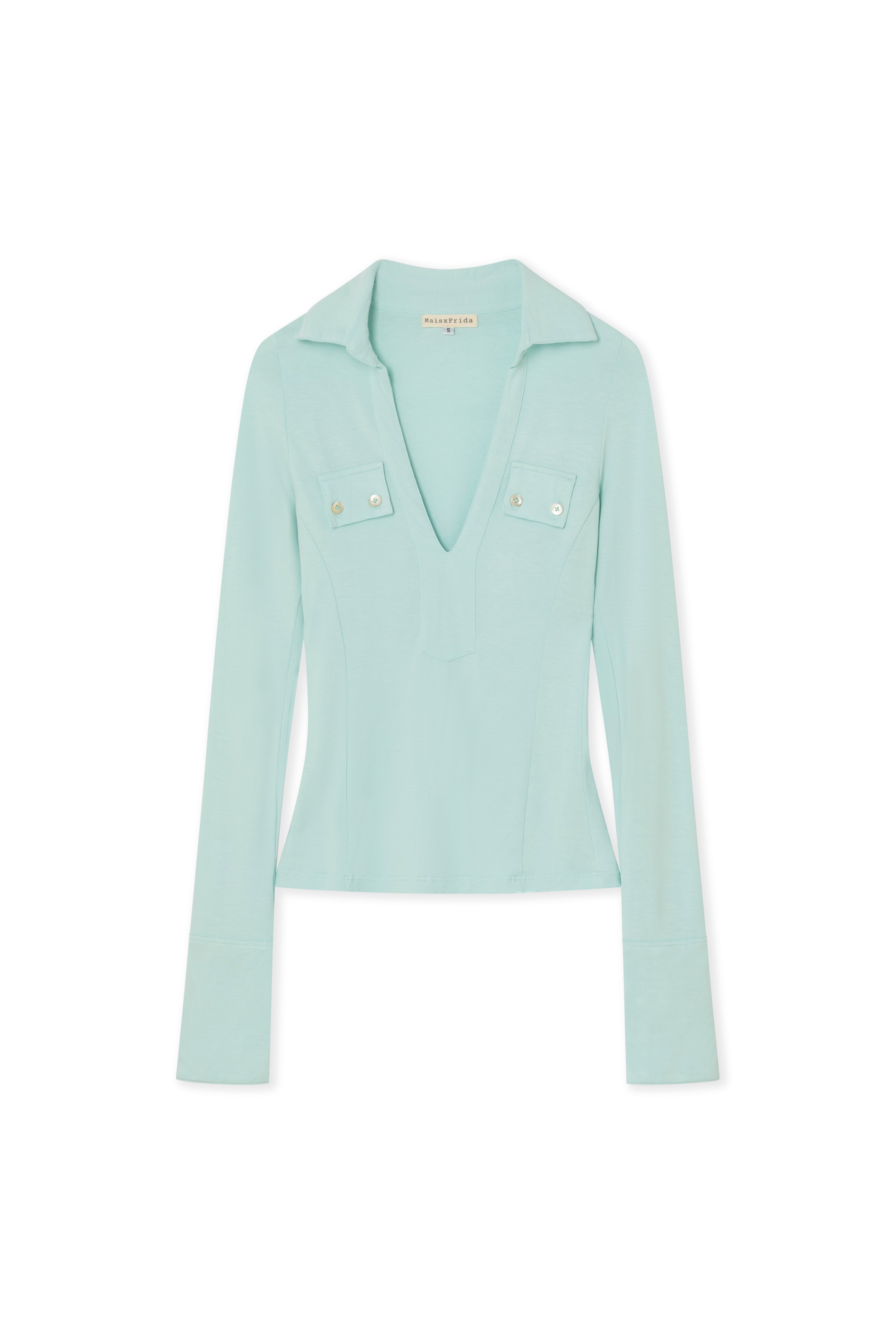 Fitted polo top with decorative buttoned pocket flaps.