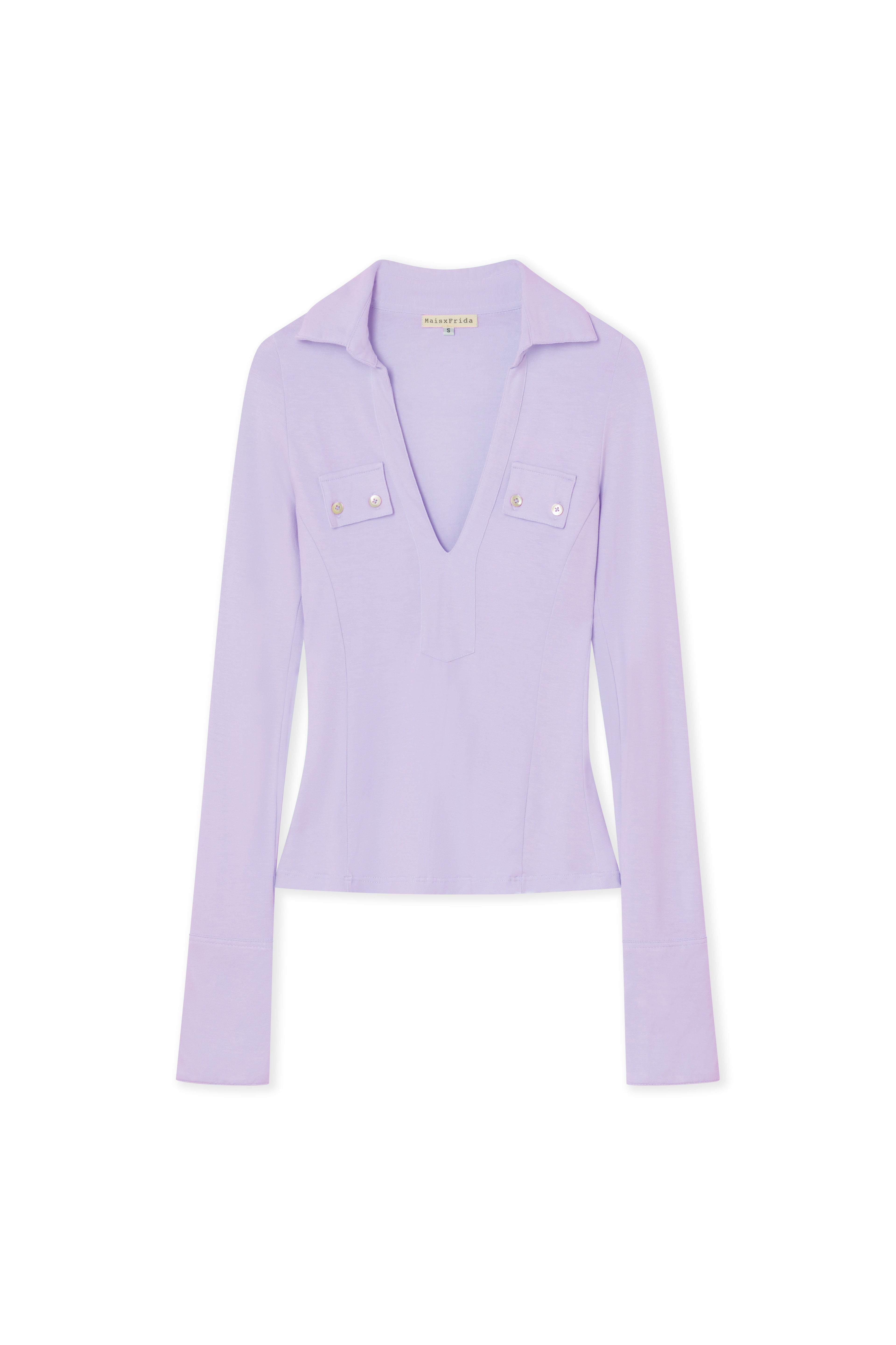 Fitted polo top with decorative buttoned pocket flaps.