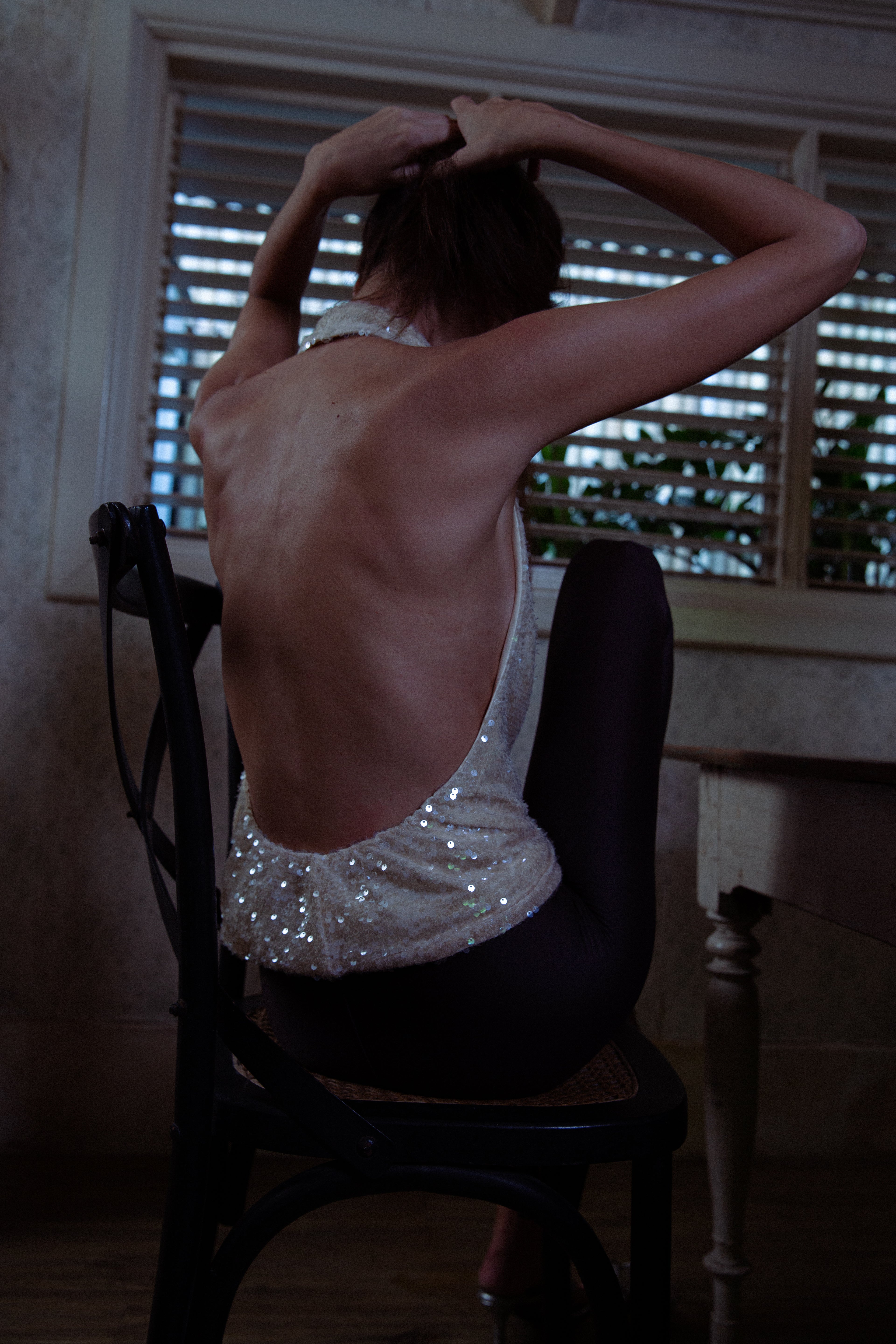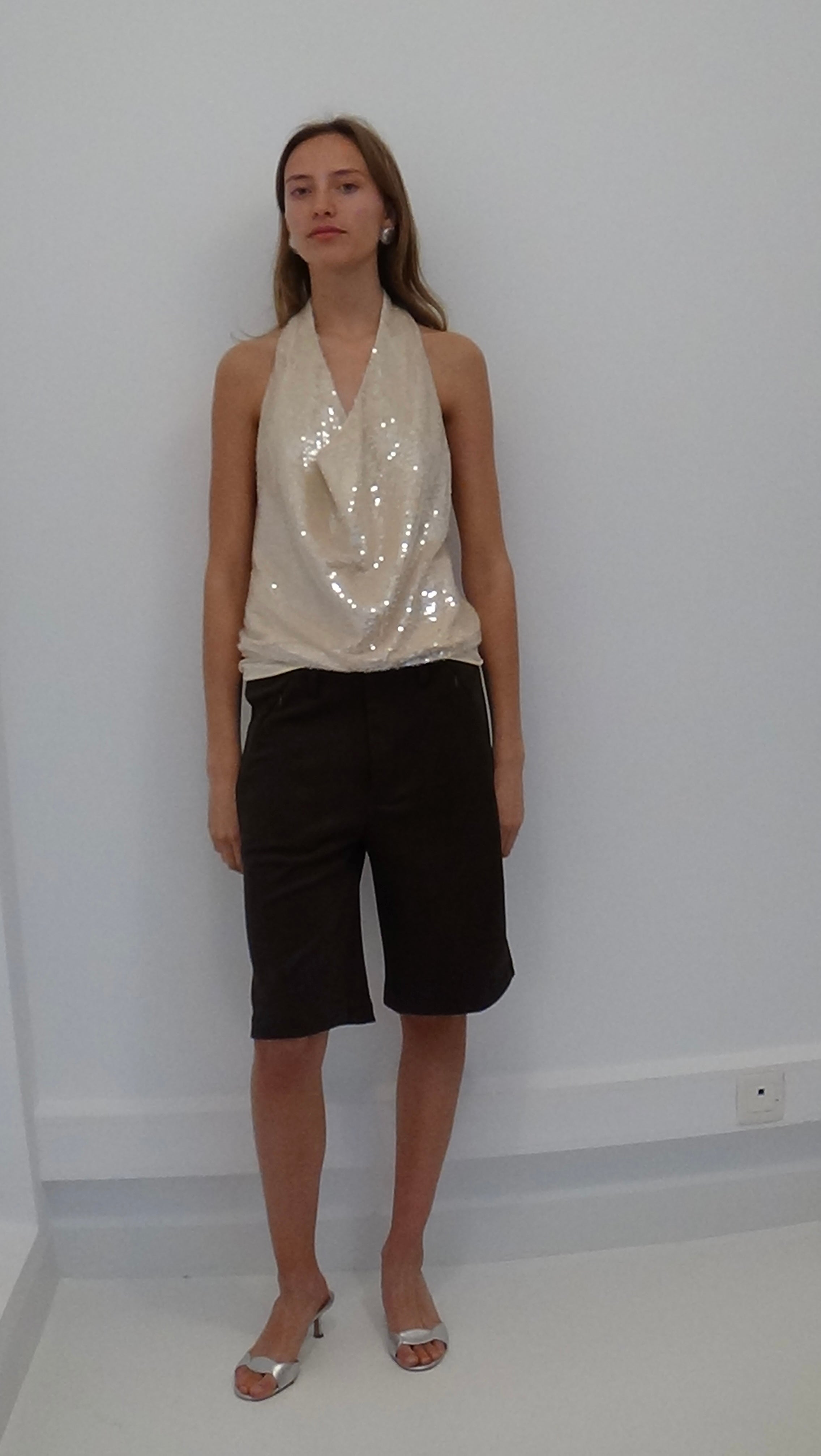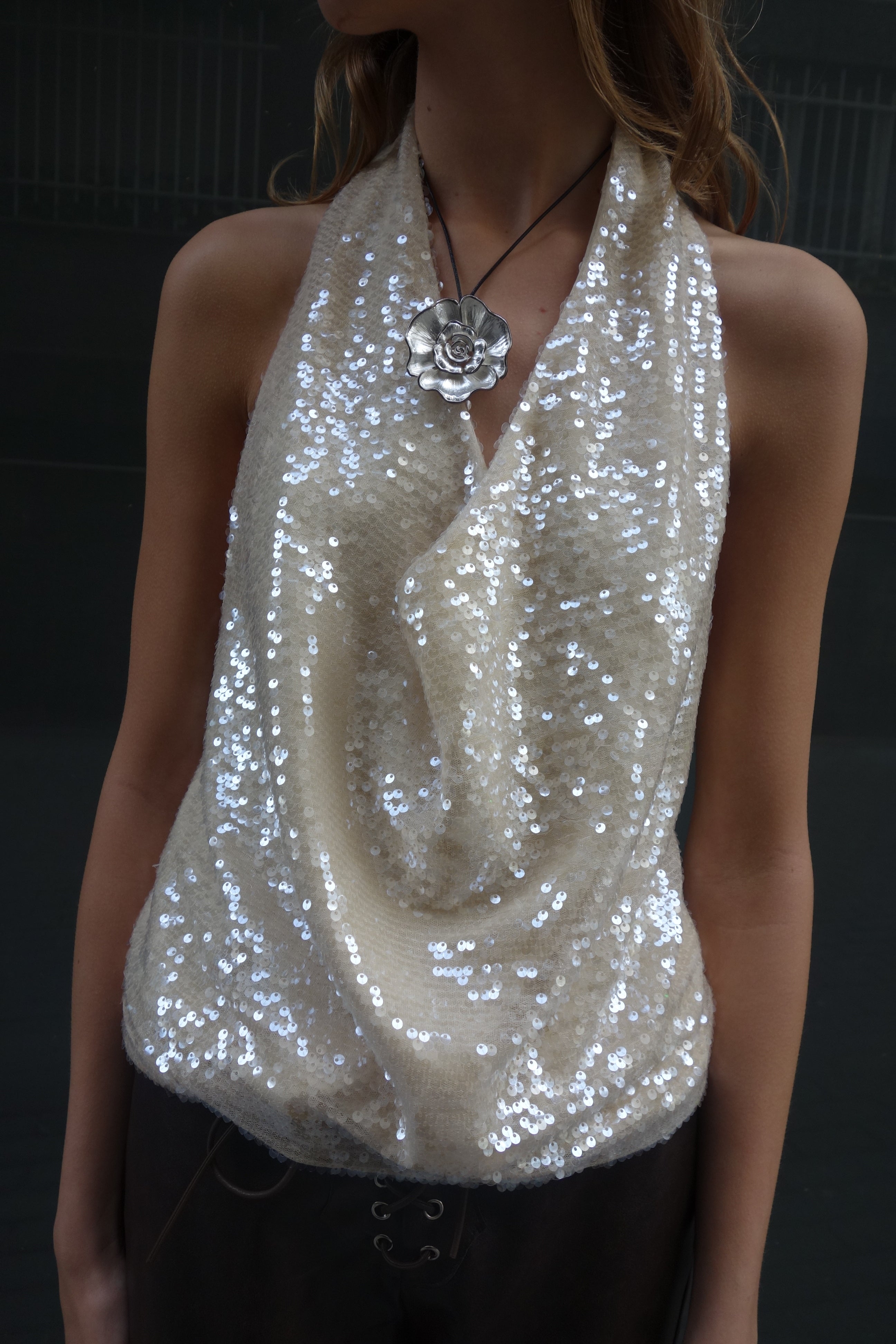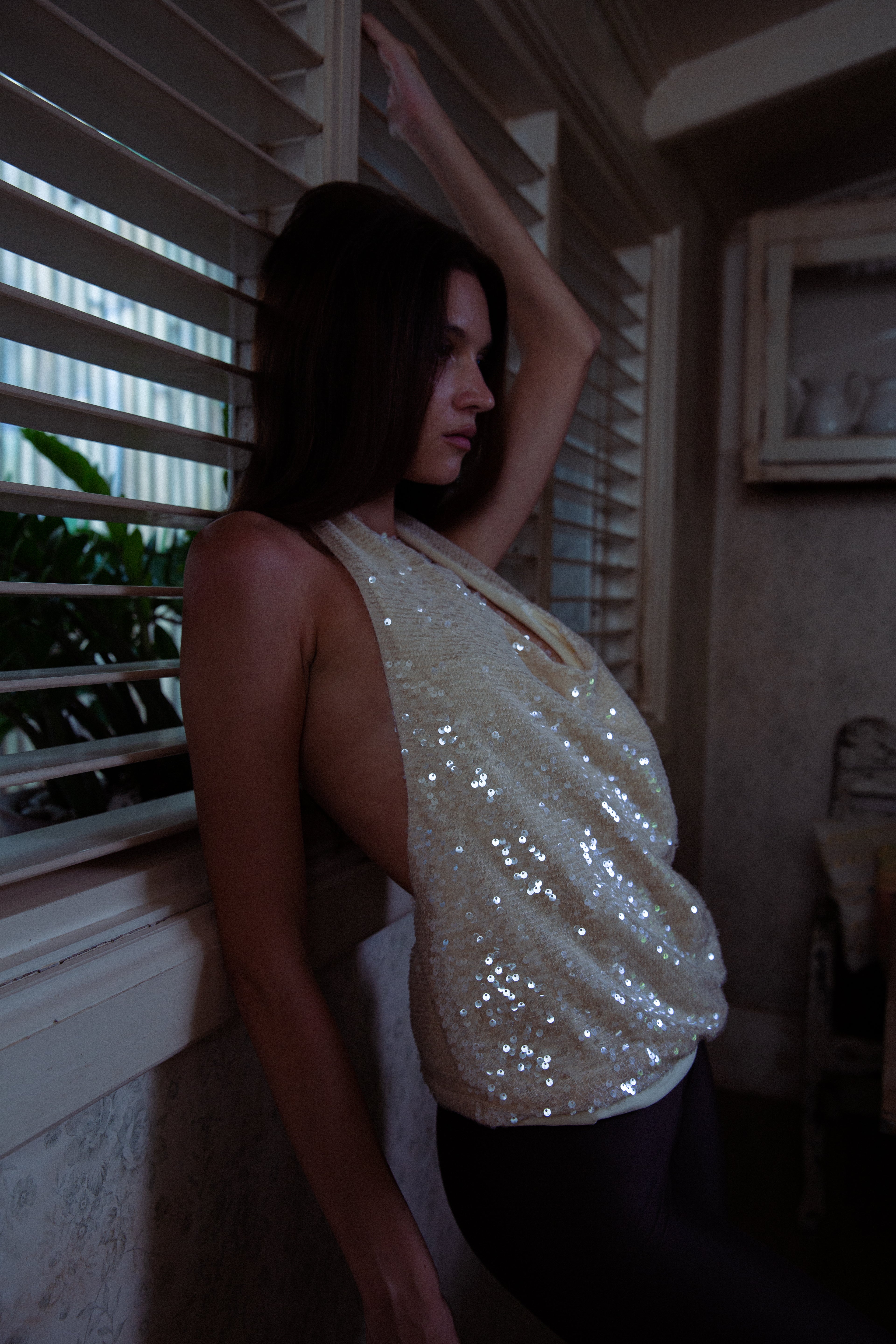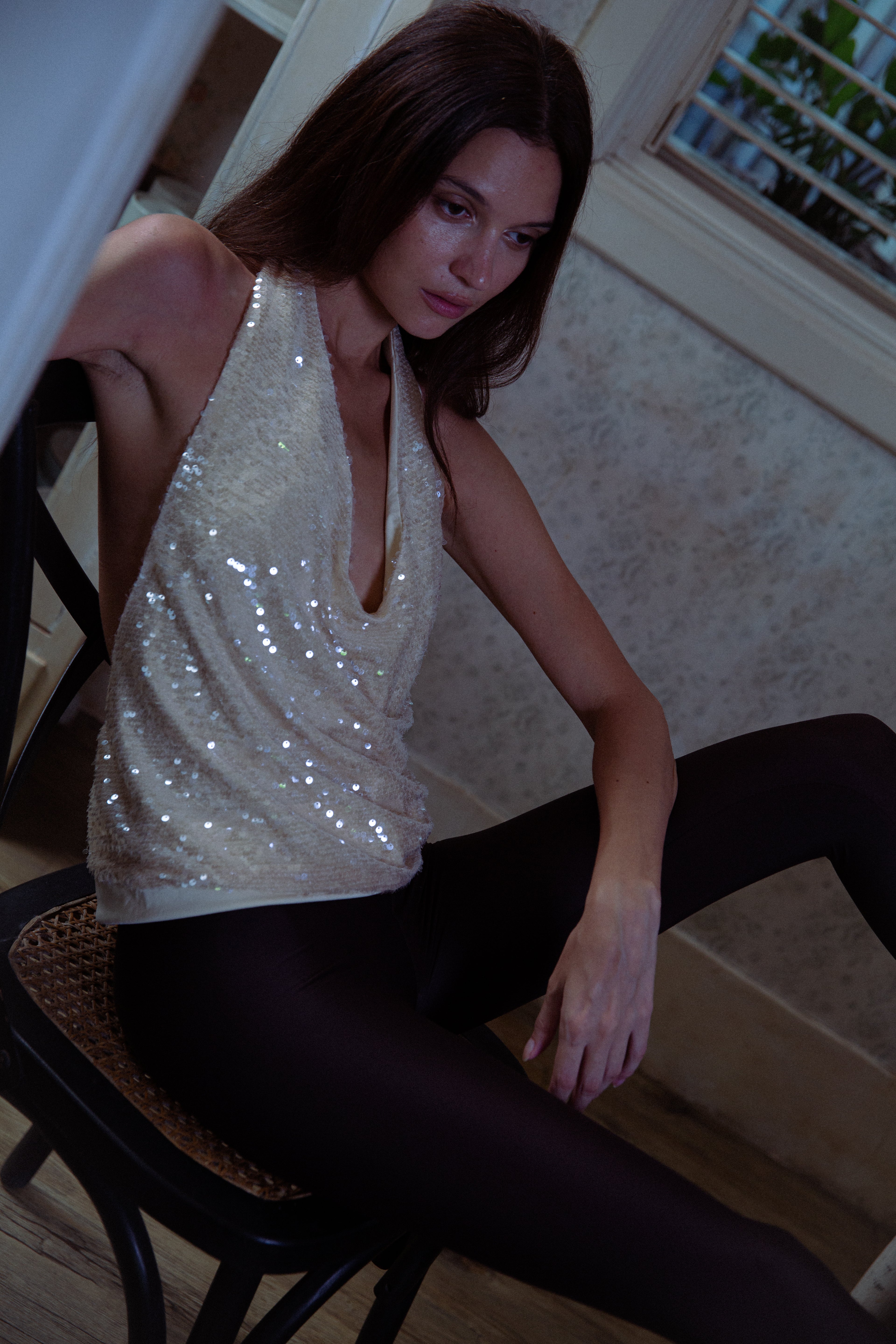 Deep-cut beige sequin top with open back and a snug cotton waistband.
