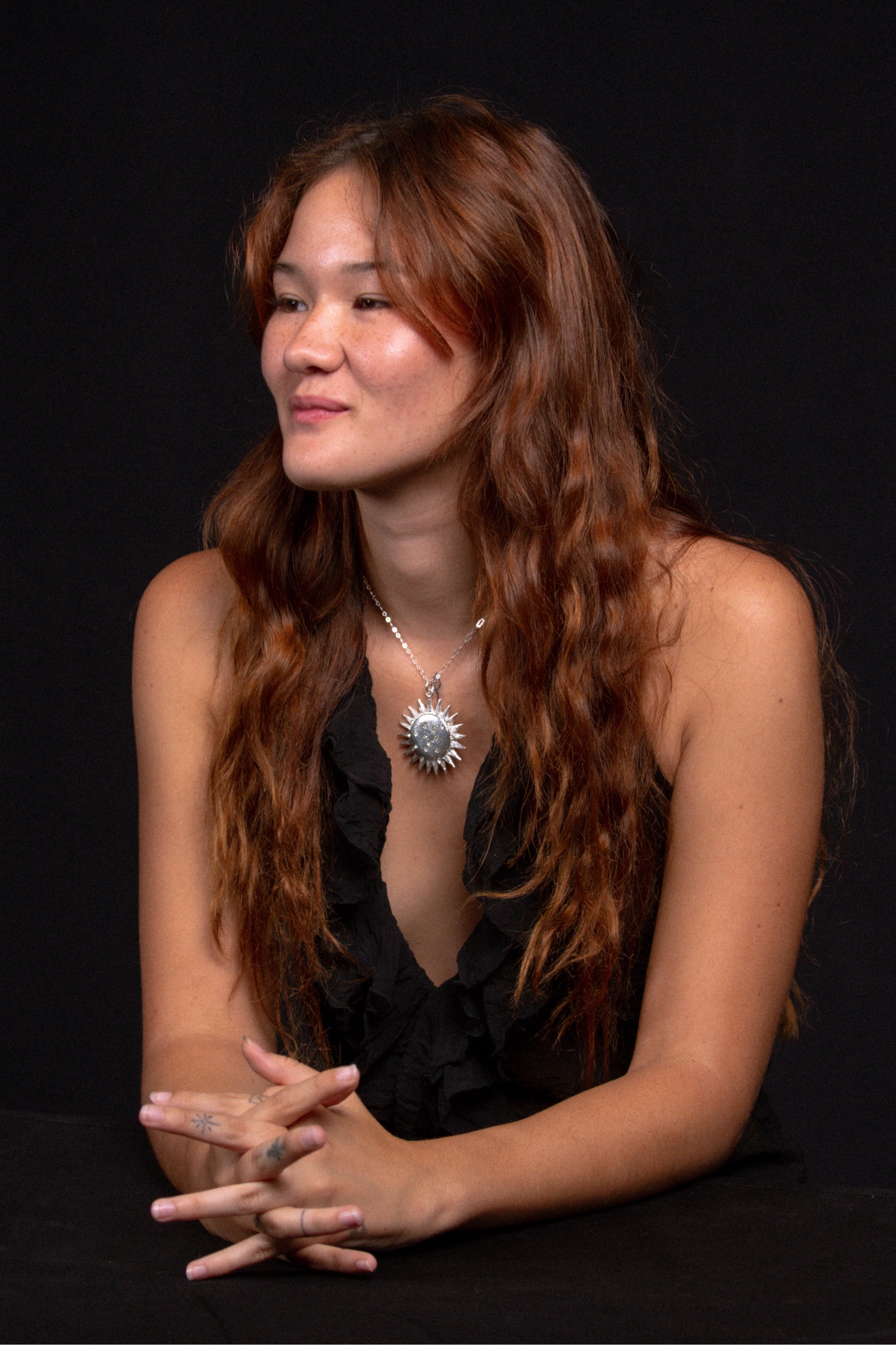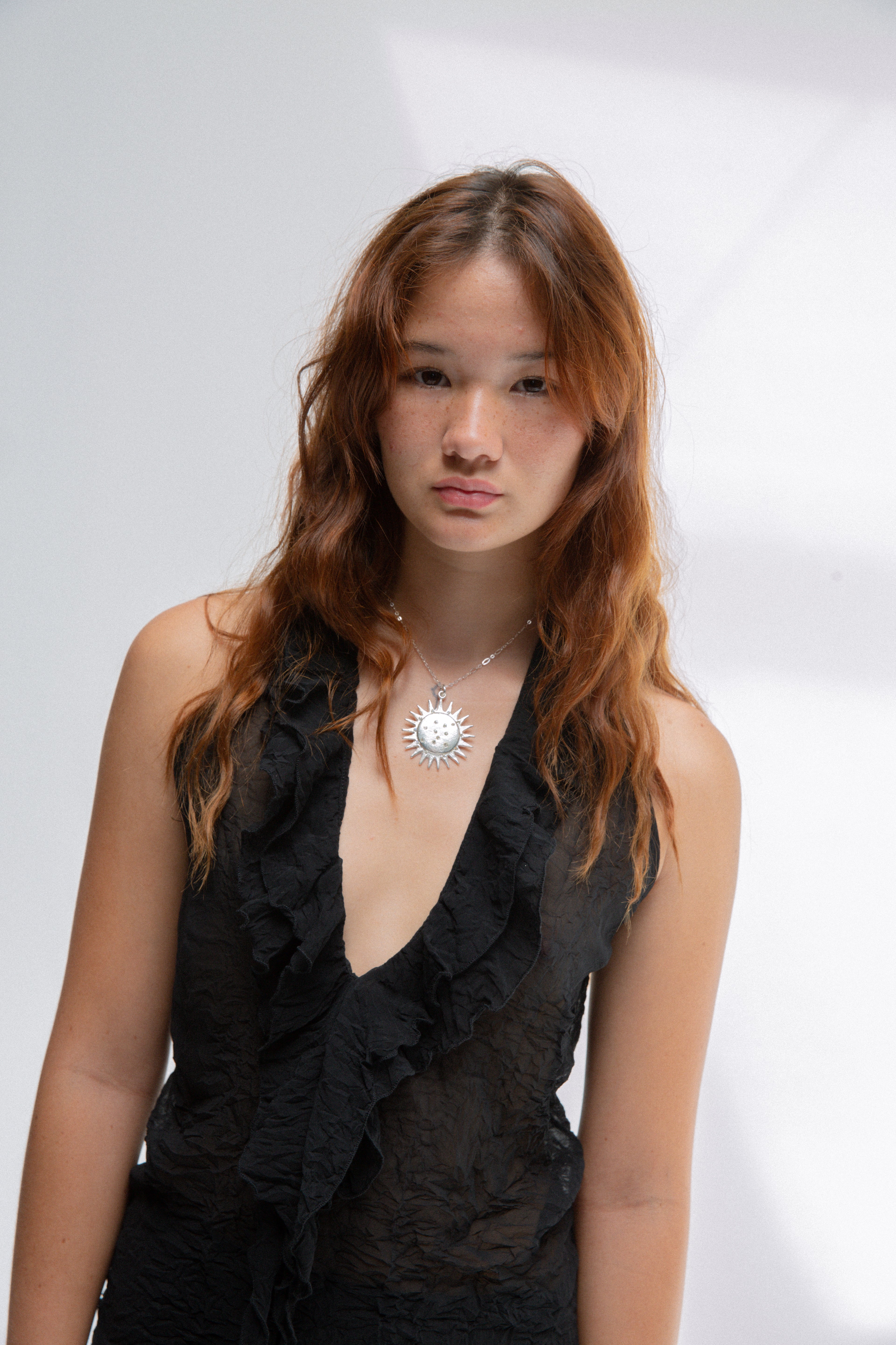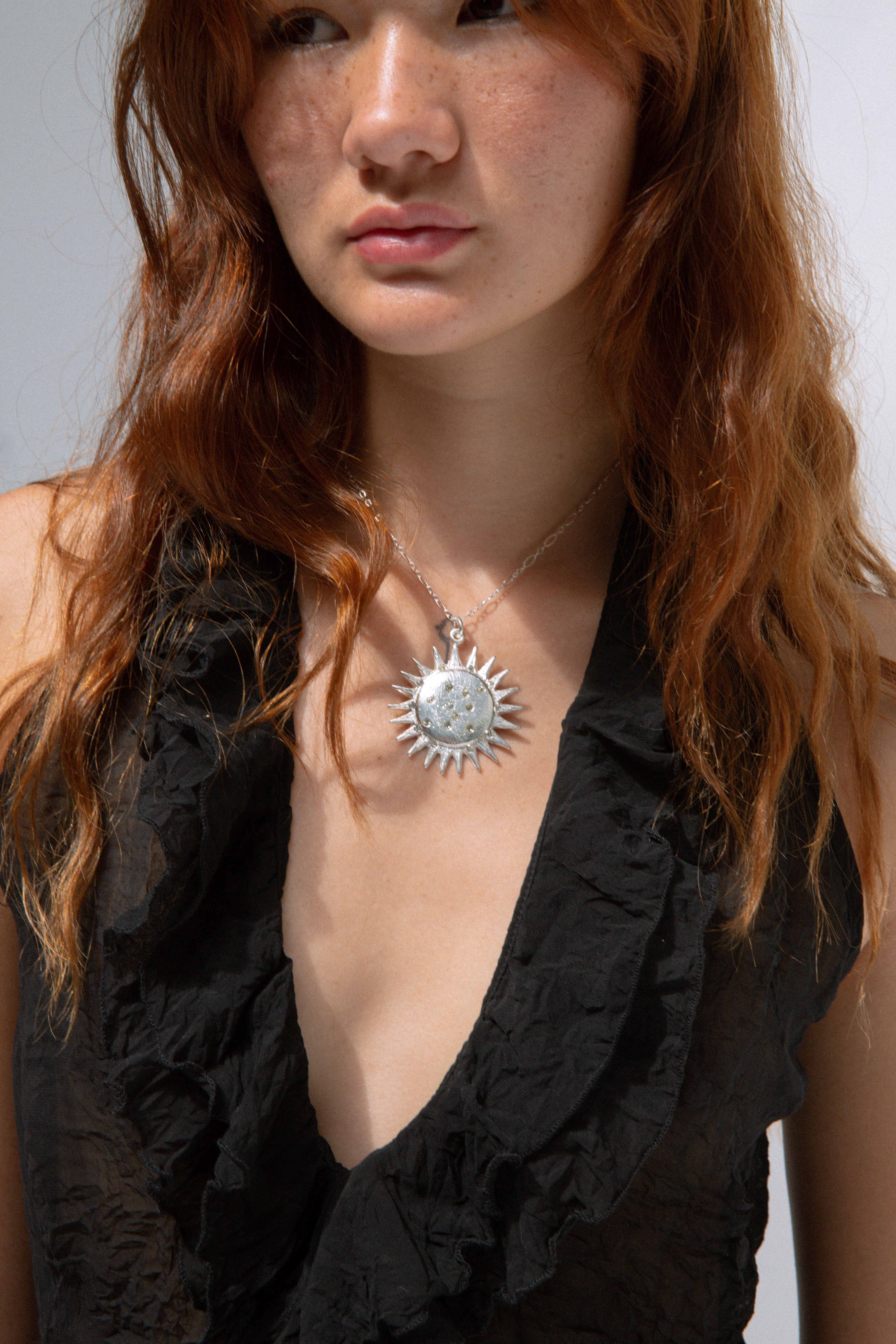 Chain necklace featuring a sun pendant crafted with rhinestones. Chain is adjustable to wear as you please.